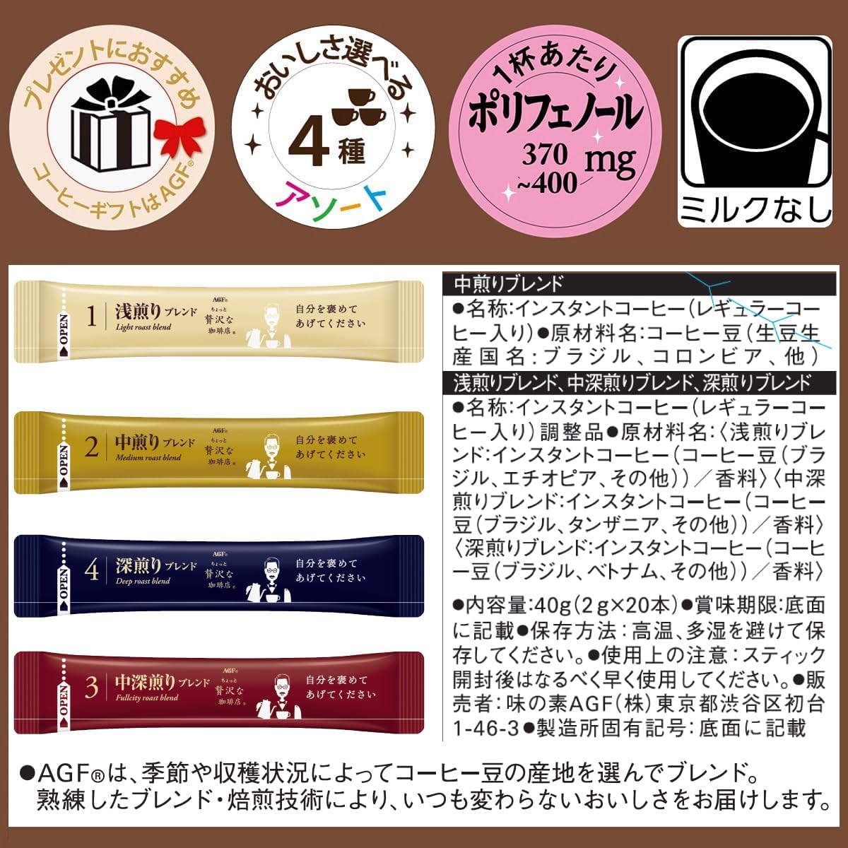 享受4种黑色咖啡。 "稍奢侈的咖啡店 黑内盒"使用精选咖啡豆AGF独有的"T2ACMI烘焙"技术,精心烘焙。 采用速溶式咖啡,无需加热,只需在-40°C下真空干燥制法,无需散发咖啡原本丰富的香味和浓郁的风味,享受冲泡的咖啡味道。 "稍奢华咖啡店 黑色内盒" 烘焙混合装 20 瓶是〈浅煎混合〉〈中烘焙混合〉〈中深烘焙混合〉〈深烘焙混合〉的不同,是一款可以享受4种讲究的味道1盒中容量的尺寸。 每杯1杯都是新鲜的独立包装棒咖啡(无黑色、无牛奶、甜味)。 不仅可以搭配黑咖啡,也可以和棒状咖啡一起享受办公室和家庭的乐趣。 由于是混合装,可以根据心情享受丰富的咖啡。 从咖啡豆的烘焙到填充都在国内工厂一贯生产,配合日本人的味道开发出来的一次性咖啡。