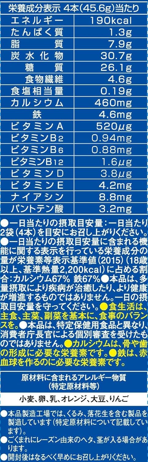 ●1袋(2支)含有钙230mg、铁2.3mg、食物纤维2.3g。 使用加利福尼亚产花边。 充分发挥果实的美味,是一款滋润的饼干。 ●每日摄取量:每天服用2袋(4瓶)。 ●每1天摄取标准量中所含的功能表示的营养成分量为营养成分标准值(18岁以上、标准热量2200kcal)的比率:钙67% 铁67%。 营养功能食品(Ca・Fe)