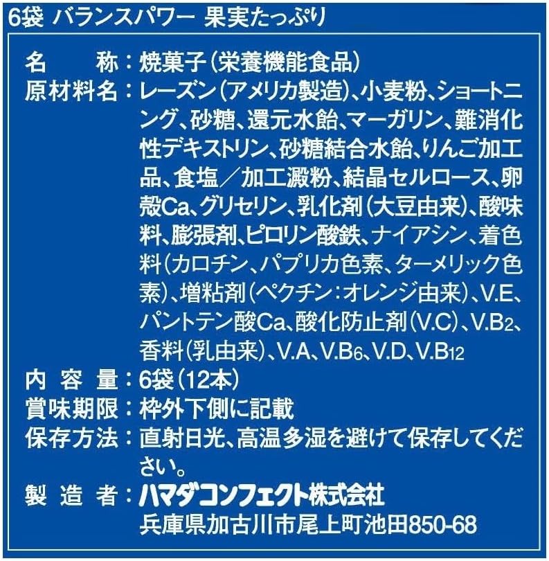 葡萄糖(美国制造)、小麦粉、起酥油、砂糖、还原糖稀、人造奶油、难消化性糊精、砂糖混合麦芽糖、苹果加工品、食盐/加工淀粉、结晶纤维素、蛋壳钙、甘油、乳化剂(大豆提取)、酸味剂、膨胀剂、焦磷酸铁、烟酸、染色剂(胡萝卜素、辣椒红色色素、辣椒色素)、增稠剂(胡椒:橙提取)、维生素E、泛酸钙、维生素C)、维生素B2 、香料(来自乳)、维生素A、维生素B6、维生素D、维生素B12