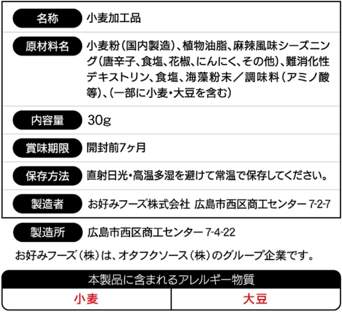 原材料:小麦粉(国内制造)、植物油脂、麻辣风味调料(辣椒、食盐、花椒、胡萝卜、其他)、难消化性糊精、食盐、海藻粉末/调味料(氨基酸等)、(部分含小麦、大豆)