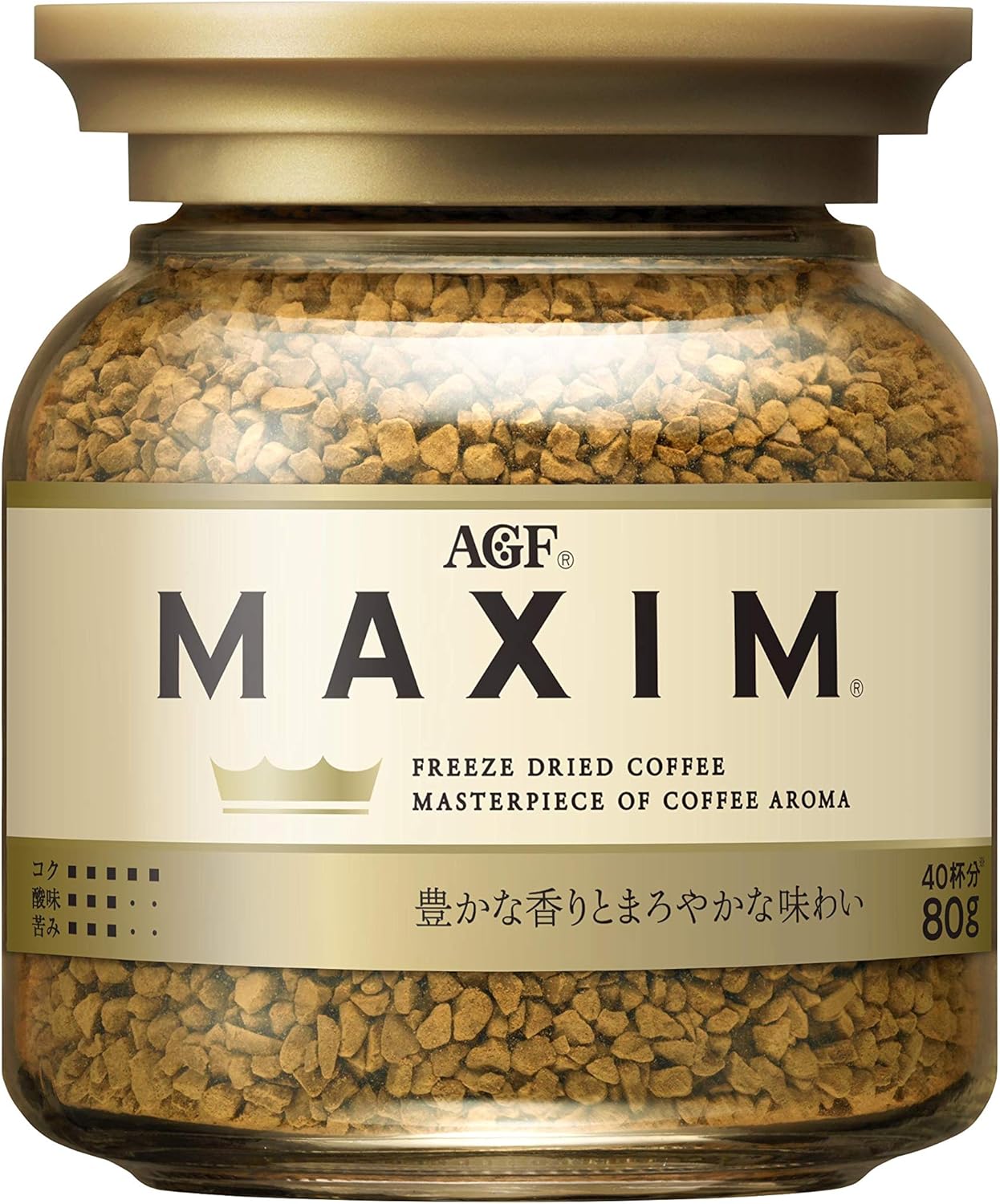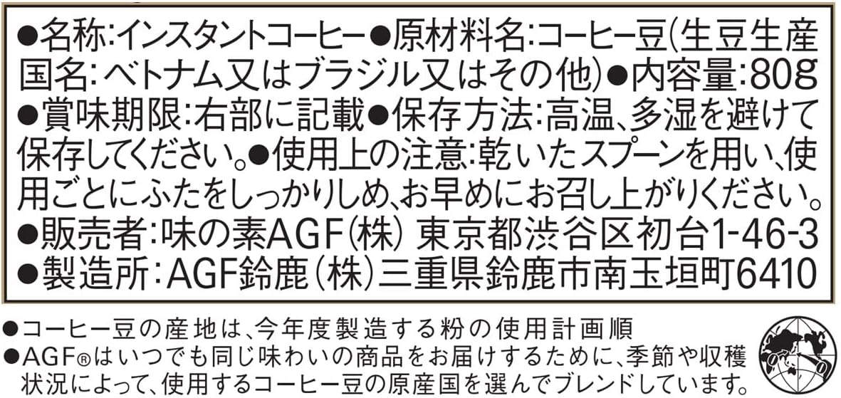 "这个味道,首先是直发。 "Maxim"一次性咖啡,使用AGF独有的"T2ACMI烘焙"技术精心烘焙。 采用速溶式咖啡,无需加热,只需在-40°C下真空干燥制法,无需散发咖啡原本丰富的香味和浓郁的风味,享受冲泡的咖啡味道。 AGF(AGF) "Maxime"瓶80克是一款可以享受丰富的香味和醇厚的味道的冷冻干燥咖啡。 易于尝试的中容量、瓶装类型。 从咖啡豆的烘焙到填充都在国内工厂进行生产,配合日本人的味道开发出来的一次性咖啡。 包装的金色王冠(金色皇冠)充满了即时咖啡的王道。