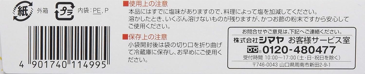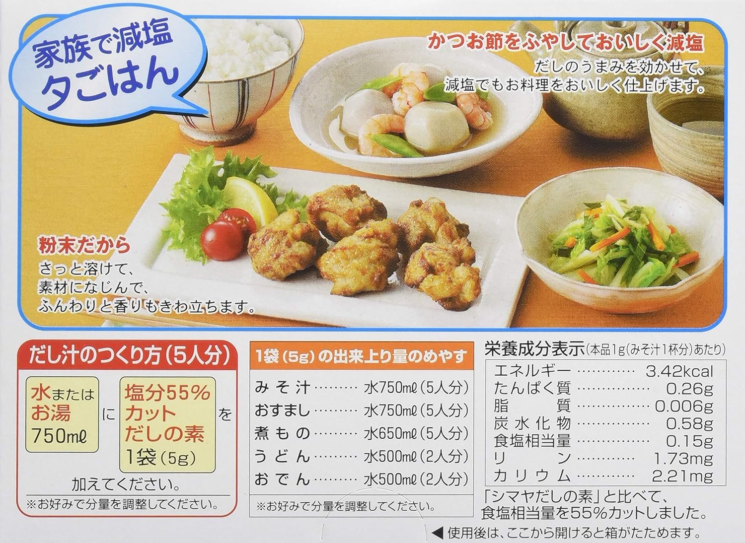 保持"Shimaiyazaki"的味道,减少55%盐型盐。 使用本公司工厂的新技术制造而成的风味丰富的鲣鱼粉末与"ShimaYamakum"大量使用(与本公司产品相比提升45%)。 此外,因为是粉末类型,所以可以轻松溶于材料,蓬松且有香气。 每天烹饪都可轻松减少盐的"Karuki认定"的废弃物。 蛋白质0.26克、脂质0.006克、碳水化合物0.58克、食盐相当量0.15克・・(每1克)