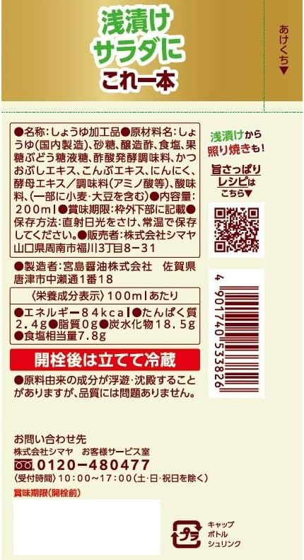 酱油(日本制造)、砂糖、酿造醋、食盐、果糖葡萄糖液糖、醋酸发酵调味料、鲣鱼提取物、海带提取物、大蒜、酵母提取物/调味料(氨基酸等)、酸味剂、(部分含小麦、大豆)。