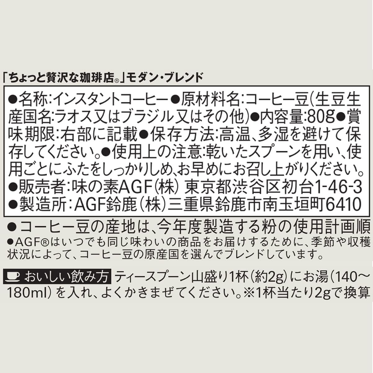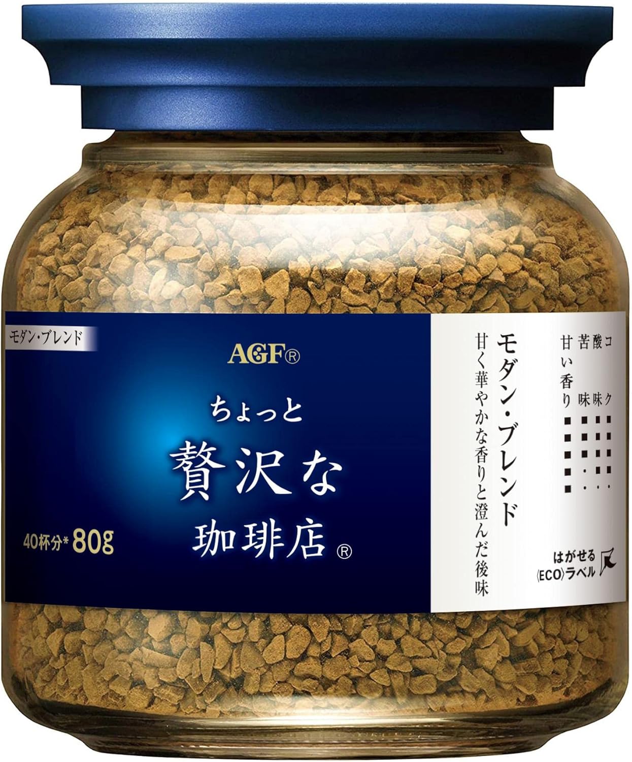 "倒入热水后,奢华黑色。 "稍奢侈的咖啡店"即时咖啡,根据季节和产地特征,将豆子的个性调配。 选择咖啡豆。 将咖啡店的大师所泡出的香味和味道融入到粉末中。 采用速溶式咖啡,无需加热,只需在-40°C下真空干燥制法,无需散发咖啡原本丰富的香味和浓郁的风味,享受冲泡的咖啡味道。 AGF(AGF) "稍奢侈的咖啡店"摩登混合瓶80克,可以尽情享受在现代咖啡专卖店中享受甜美的香气和清澈的余味。 易于尝试的中容量、瓶装类型。 从咖啡豆的烘焙到填充都在国内工厂进行生产,根据细腻的日本人的味道开发。 将咖啡店的大师所泡出的香味和味道溶于粉末中。 然后倒入热水。 请尽情享受香气的奢华黑色咖啡。