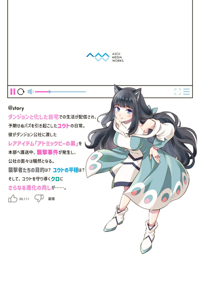 ダンジョンと化した自宅での生活が配信され、予期せぬバズを引き起こしたユウトの日常。彼がダンジョン公社に渡したレアアイテム「アトミックビーの巣」を本部へ護送中、襲撃事件が発生し、公社の面々は騒然となる。襲撃者たちの目的は? ユウトの平穏は? そして、ユウトを守り導くクロにさらなる進化の兆しが……。