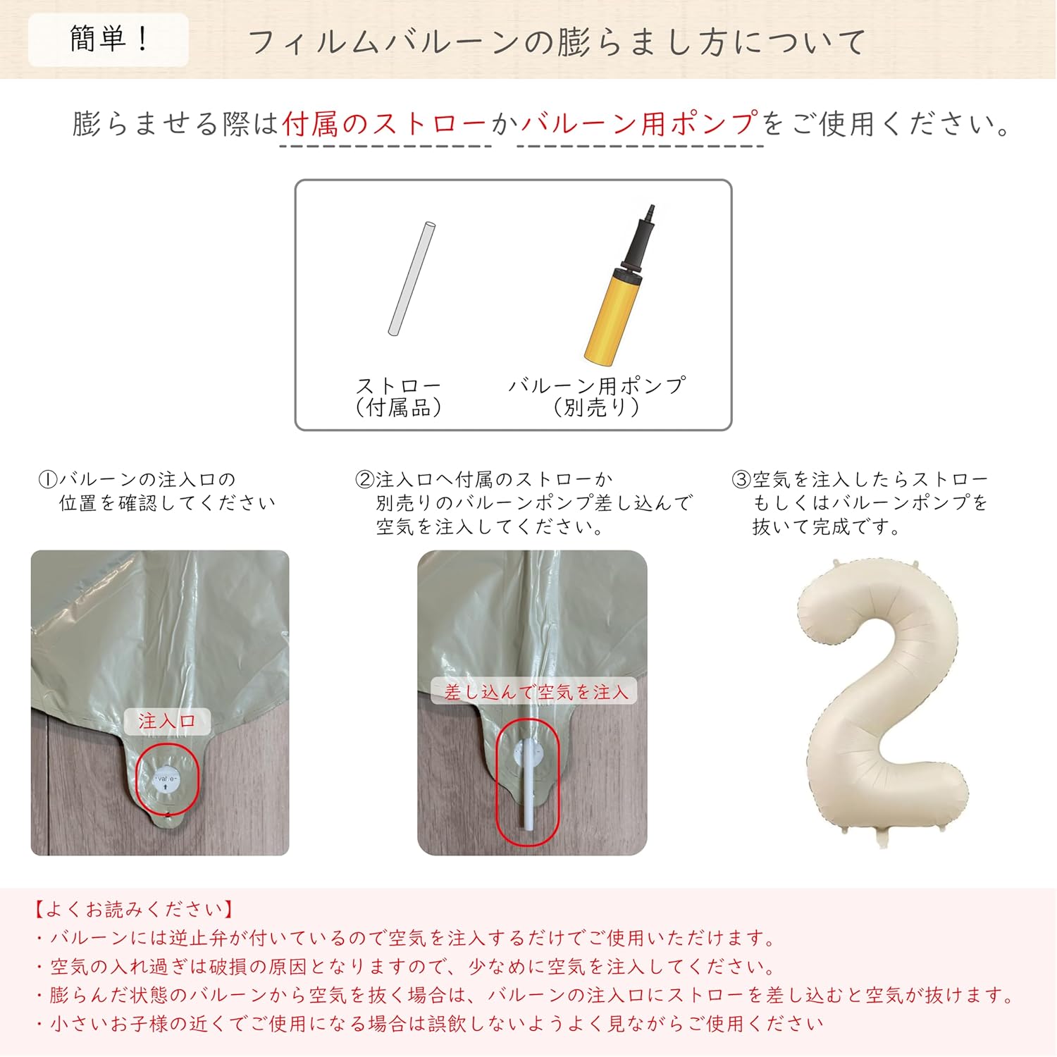 【point1】约70cm的大奶油色数字气球! 可从0~9个中选择。 【特点2】带有膨胀用的迷你吸管。 市面上的气球用泵也可以膨胀。 【特点3】使用耐用的薄膜材料制作而成。 用完后用附带的吸管可以排出空气,次次次再利用方便。 【适合多种活动! 】生日、纪念日、感应、婚礼、纪念日、毕业典礼、周年纪念、婚礼、店铺开业等场合都可以使用。 【使用方法】使用吸管或气球用泵,只需从注入口中放入80-90%的空气! 附带防止逆流阀,无需绑住注入口。