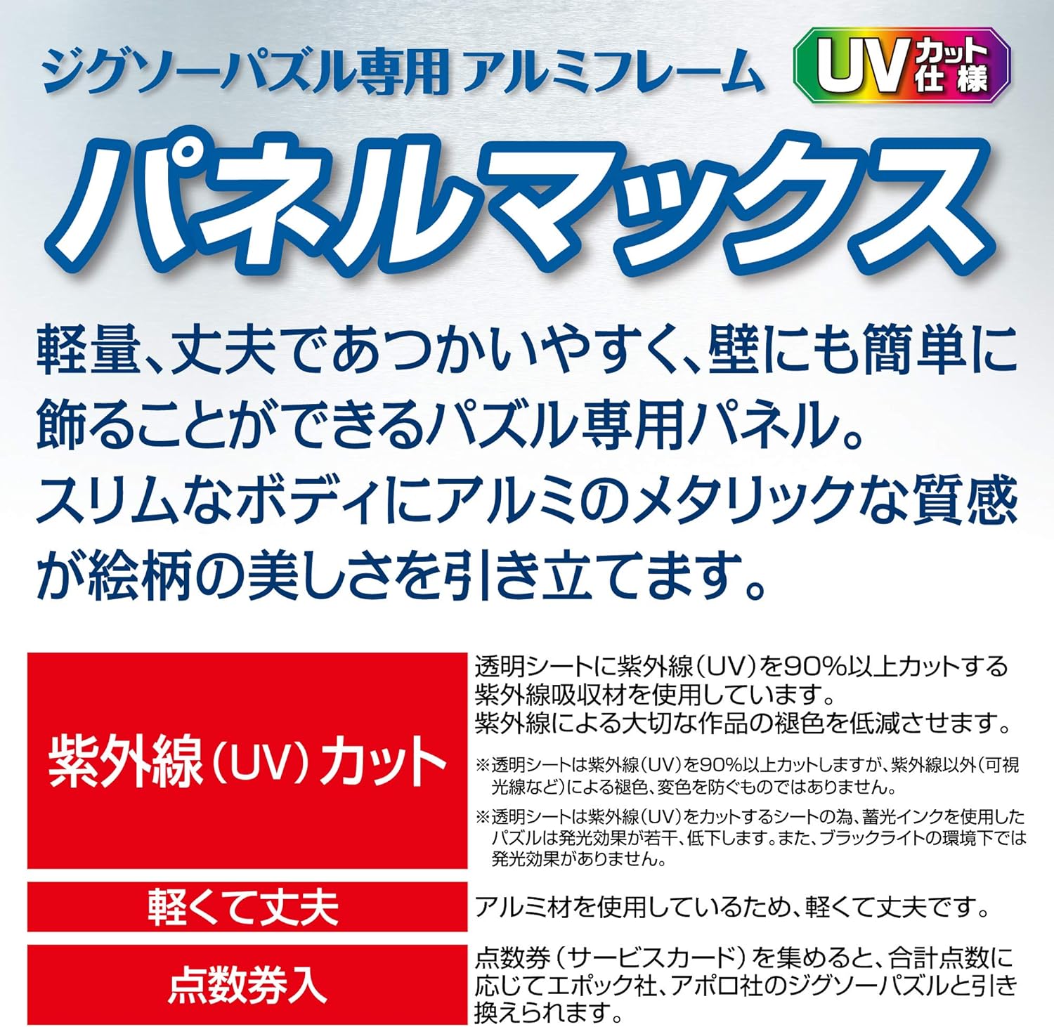 由于使用了轻质的铝,所以结实且容易撞到墙壁上 可以装饰的拼图专用面板。 铝制沉稳的金属质感。 纤细的机身不会太过张扬,凸显图案的美感。 黑色,在给图案带来存在感的同时自然融入房间。 适用拼图尺寸:50x75厘米 [套装内容] 数量券 (由Amazon.co.jp提供)