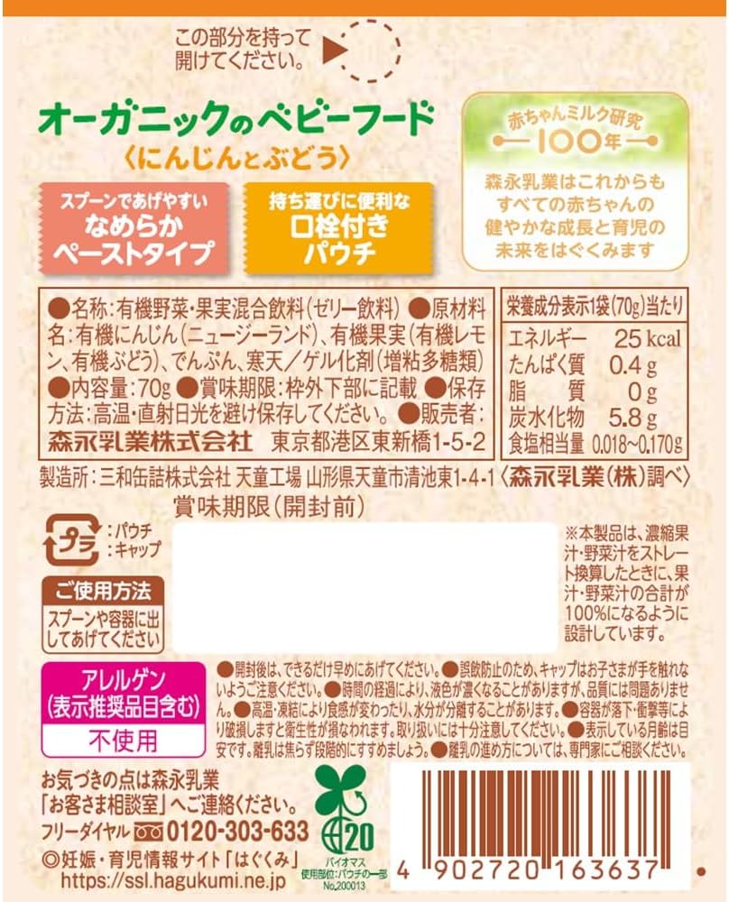 本款婴儿食品已取得有机JAS认证。 胡萝卜和葡萄加入柠檬,便于食用。