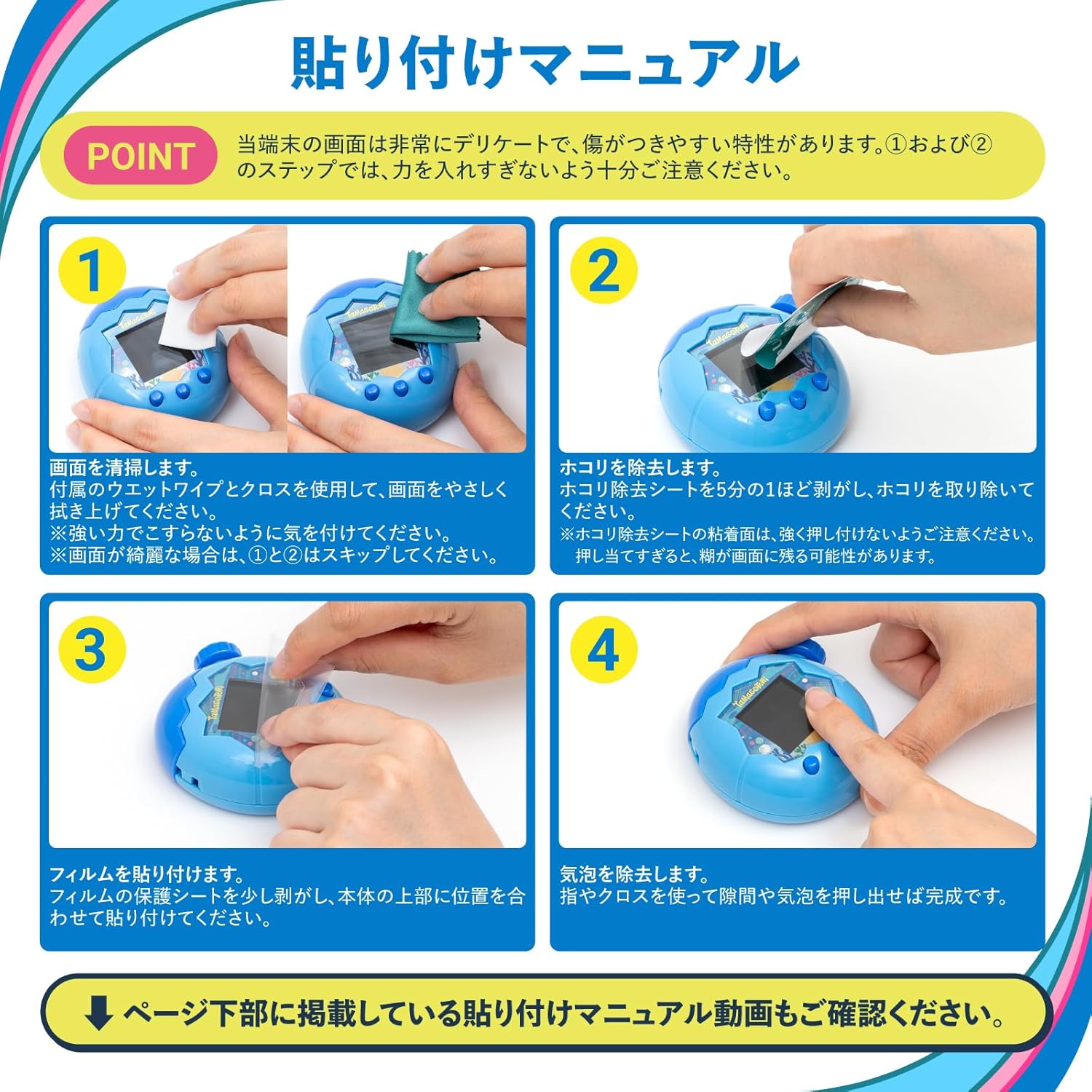 【适用机种】:Tamagotchi Paradise(Tamagotchi Paradise)用 【丰富的套装内容】:《保护膜1片》、《擦拭纸》、《清洁布》、《去除灰尘贴纸》支持贴膜。 [透明类型]:实现了如同未贴一般的透明感的高透玻璃,在保护的同时享受游戏原本的影像。 抗菌率99.9%:高抗菌率,保持屏幕清洁。 【防指纹】不易沾上指纹和污垢,即使附着也很简单。 [耐划伤] 采用防刮硬涂层加工,经久耐用。 【防止气泡】吸附面使用特殊硅树脂,可以简单地按压气泡。