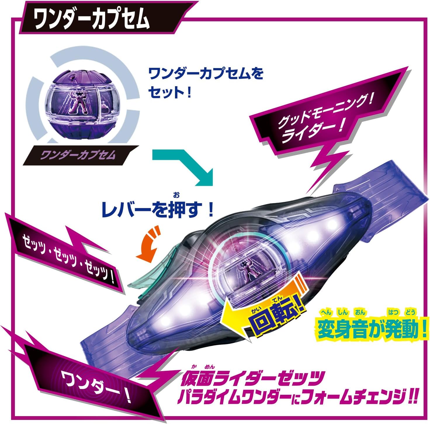 来自《假面骑士Zeets》, "变身腰带 DX Zet's Drive 4 档更换套装"登场! 作为史上第一次,佩戴在胸部上的变身腰带诞生! 内置9个LED,带带的腰带整体发光,超发光规格! 旋转胶囊,享受变身&必杀技游戏。 假面骑士Zeuts变身・改变使用形态的"冲击胶囊","Stream Capsumm"、"Licca Capsumm"、"One Derop-semm"附属品 [套装内容] ・石英螺丝刀主体…1 ・冲击胶囊......1 ・Stream Capsumm…1 ・LIP BERRY CAPSAM…1 ・Wonder Capsumm…1 [使用电池] 7号干电池×3节(另售) (本商品套装以外不包括在内。 )