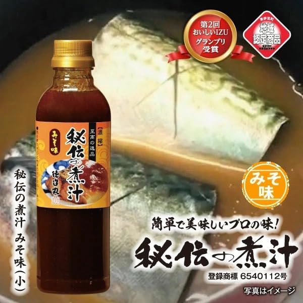 商品介绍 伊豆稻取渔港的人气食处,网元料理德造丸。 鱼屋直营的考究,制作出难吃的鲭鱼味增煮也不会失败的秘传炖味增味。 伊豆传统的甘甜的青花鱼味增煮也不会有味或消除气味等烦恼,在家也能用这一根就可以做出面前食材的美味。 将煮汁稀释至2倍~3倍,沸腾后将鱼煮约10分钟即可。 还有许多用途,可用于盛饭、蔬菜炒、醋味噌等。 原材料・成分 米味增、砂糖、油、味、酒、糖稀、余味油、生姜、葱、牛蒡/酒精、调味料(氨基酸等)、(部分含大豆、小麦)