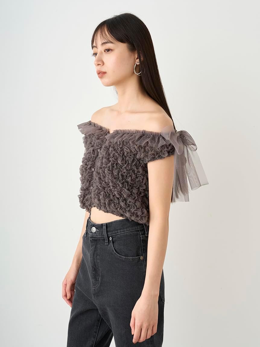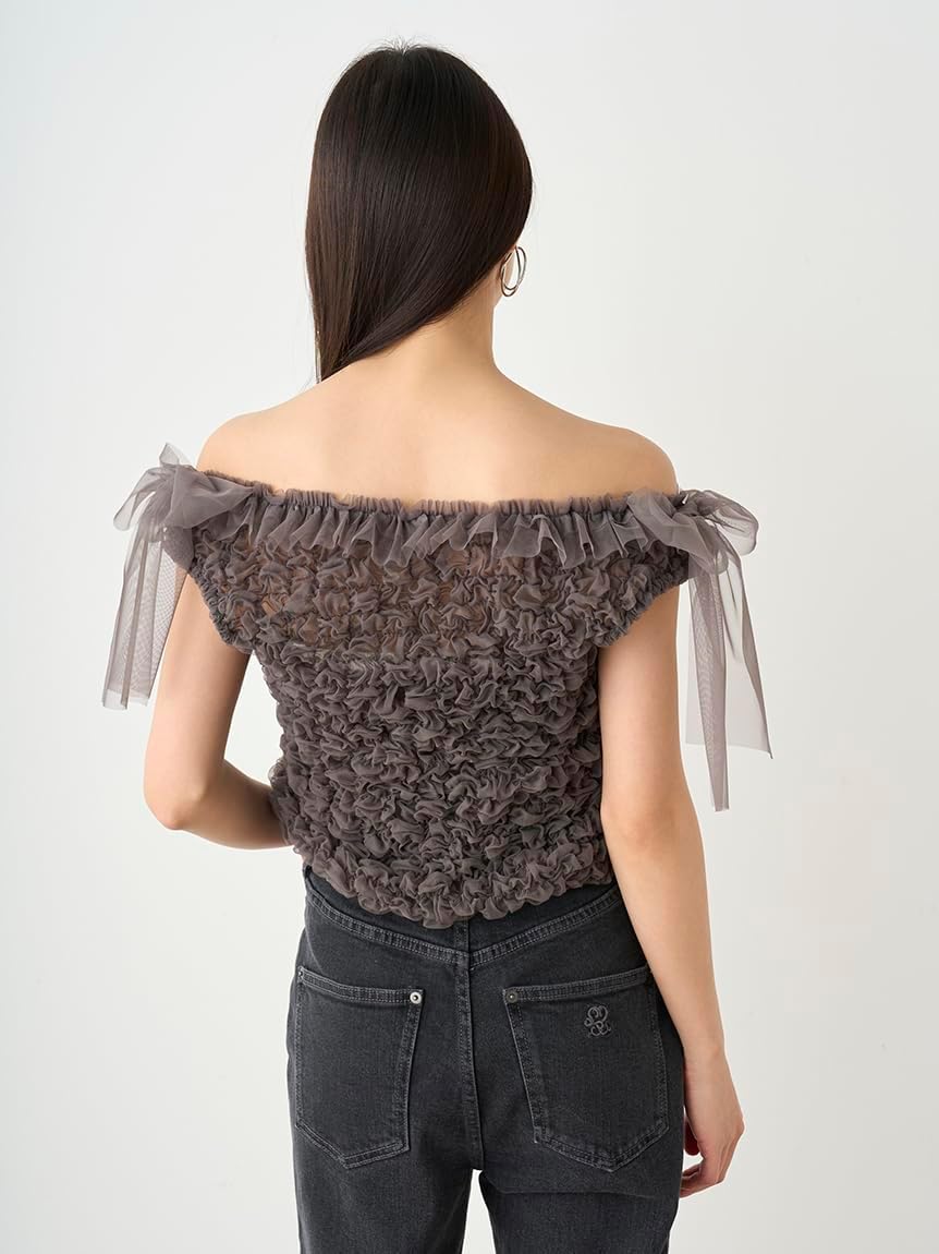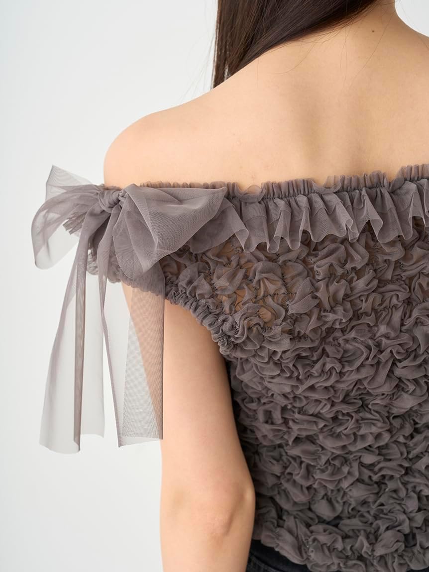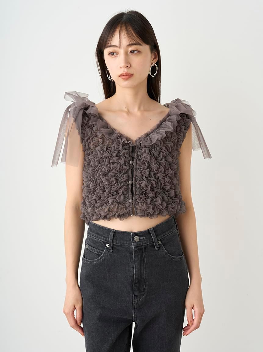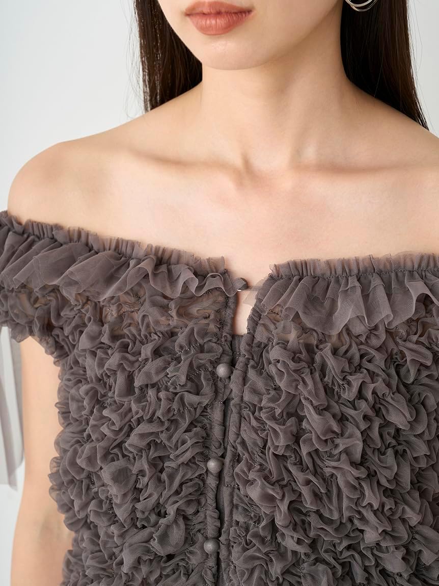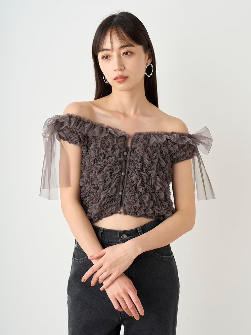 【薄纱抽褶是柔软的表情的七分上衣】 [Design/Styling] 充满女性魅力的薄纱七分上衣。 具有透明感且柔软的薄纱材料加上原创的图案,给人一种轻快的表情,给人留下深刻印象的面料。 外观小巧,但有弹性,贴合身体,轻便易穿着。 建议穿在肩上。 针织材质的抹胸,可放心穿着。 V字领采用细腻的褶边,并且肩部采用蓬松的大蝴蝶结,给人一种可爱的感觉。 [面料] 有成熟印象的象牙色、女士深灰色、今年流行颜色的柔软薄荷色3种颜色。 无罩杯抹胸。 透明感:有 内衬:带内衬 弹性:有 光泽感;无 面料厚度:偏薄 【推荐骨骼型】 ■骨骼波浪 ■骨骼自然