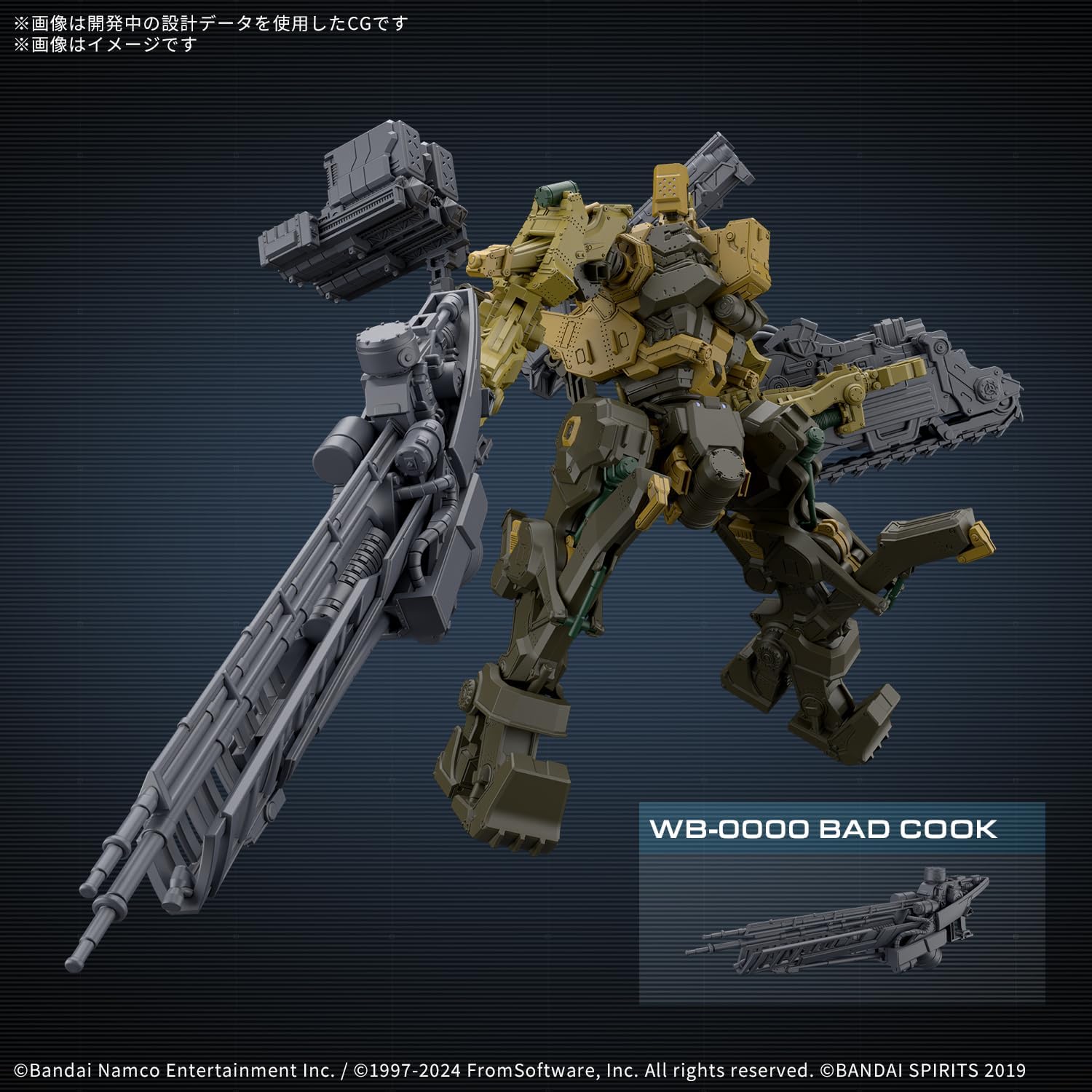 "ARMORED CORE FIRES OF RUBICON"的商品以"30 MINUTES MISSIONS"系列商品化。 在系列的关键理念"简单组装""定制游戏"中,Ornest·Blueuts"登场。 ■头部、核心、腕部、腿部各采用系列通用结构,与游戏中一样,可享受塑料模型的乐趣。 ■双肩武器和一部分左手武器的安装采用3mm接头,可应对各种动作。 ■武器附带"WB-0000 BAD COOK"、"WB-0010 DOUBLE TROUBLE"、"BML-G2/P19SPL-12"、"SB-033M MORLEY"。 ■附带"WB-0010 DOUBLE TROUBLE"的链锯可收拢状态和展开状态的2种。