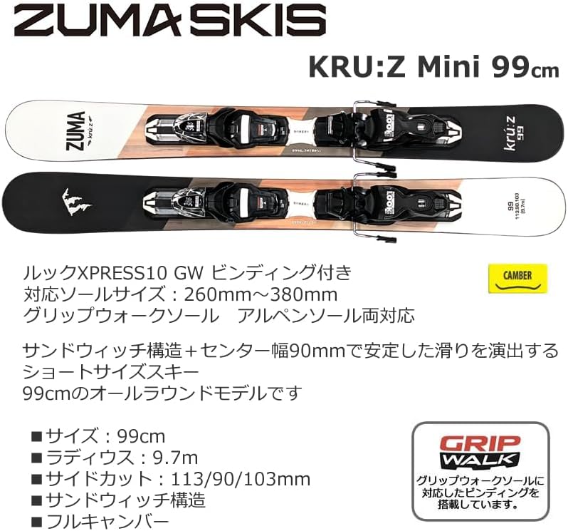 ZUMA TSUMA 滑雪 KRU:Z Mini 99 SW 在自由风格滑雪场试验中活跃的ZUMA SKIS。 99厘米易于使用的全能型山地形状。 兼具柔软弹性与轻盈性的款式。 锐利的边缘和。 与跑步时的恢复容易,感受99cm的键盘无法比拟的稳定感和操作性。 ・型号:KRU:Z 99 SW ・类型:SKIBOARD FREERIDE Look XPRESS10 GW 固定器 ※可轻松调节靴子的鞋底长260mm-380mm的款式。 GRIPWALK 适用于抓地外底靴子。 ・尺寸:99cm 重量:1.84千克(仅1对板) ・侧切:11390113mm ・结构:Sandwitch ・固定器:锁扣 XPRESS10 GW 形状:曲线 【本公司的滑雪板均为日本正规产品。 如果是邮购,也可以接受制造商的正规保修,请放心】 ・该商品在组装起来的状态下发货。 未调整尺寸、解放值。 使用前请务必在滑雪专卖店或租赁店进行调整。 ZUMA ski 2025,zuma ski 24-25模型,zuma ski japan,ZUMA 24-25,swallow 24-25,施华洛世奇 24-25,SWALLOW 滑雪,