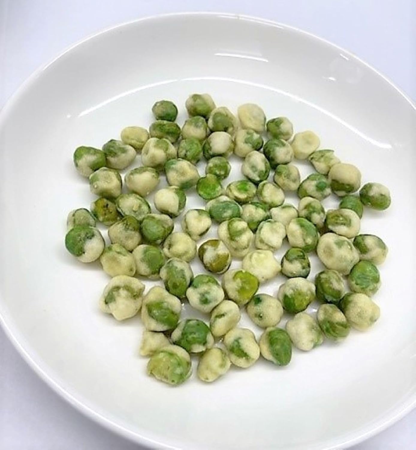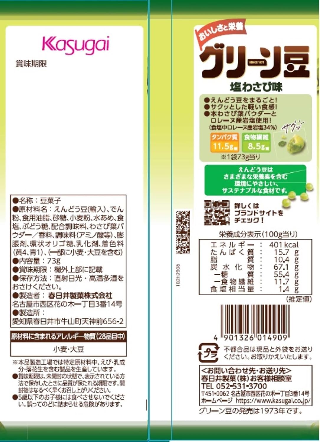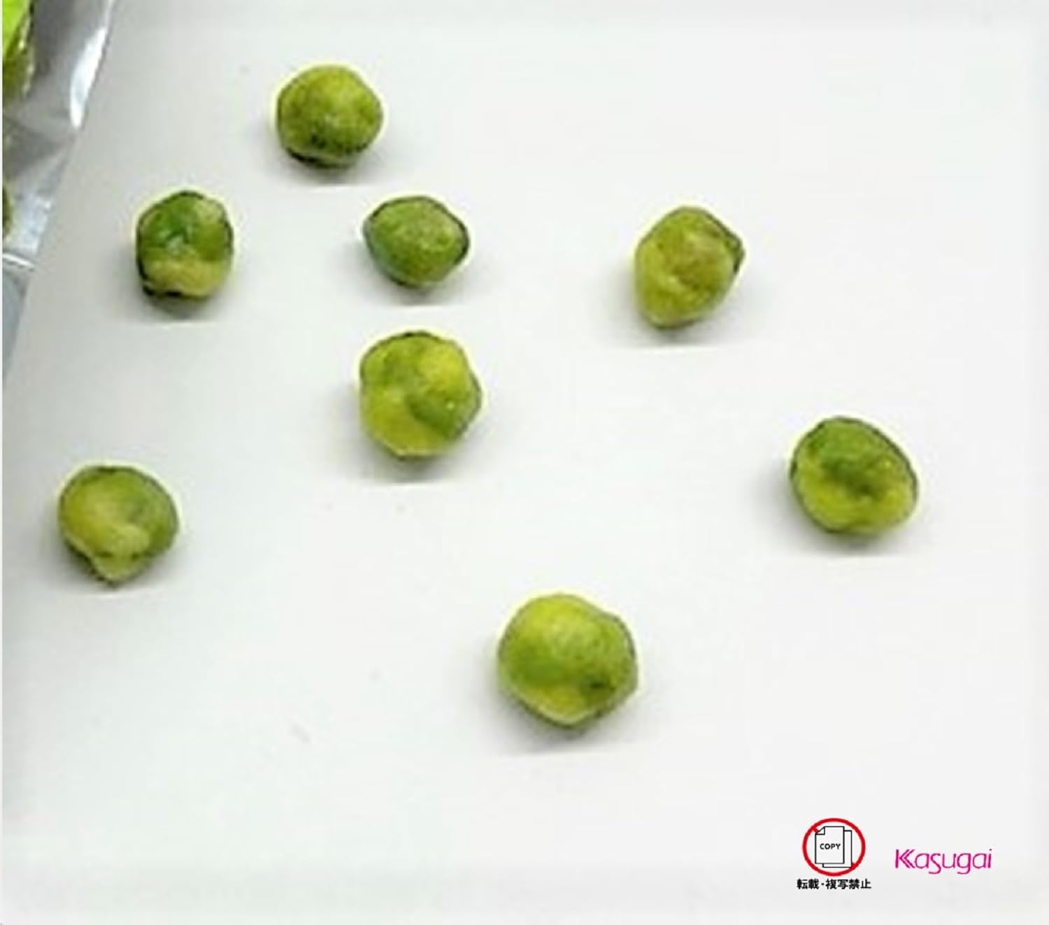 豌豆(进口)、淀粉、食用油脂、砂糖、小麦粉、糖稀、食盐、葡萄糖、混合调味料、芥末叶粉/香料、调味料(氨基酸等)、膨胀剂、环状低聚糖、乳化剂、色素(黄4、青1)、(部分含有小麦、大豆)
