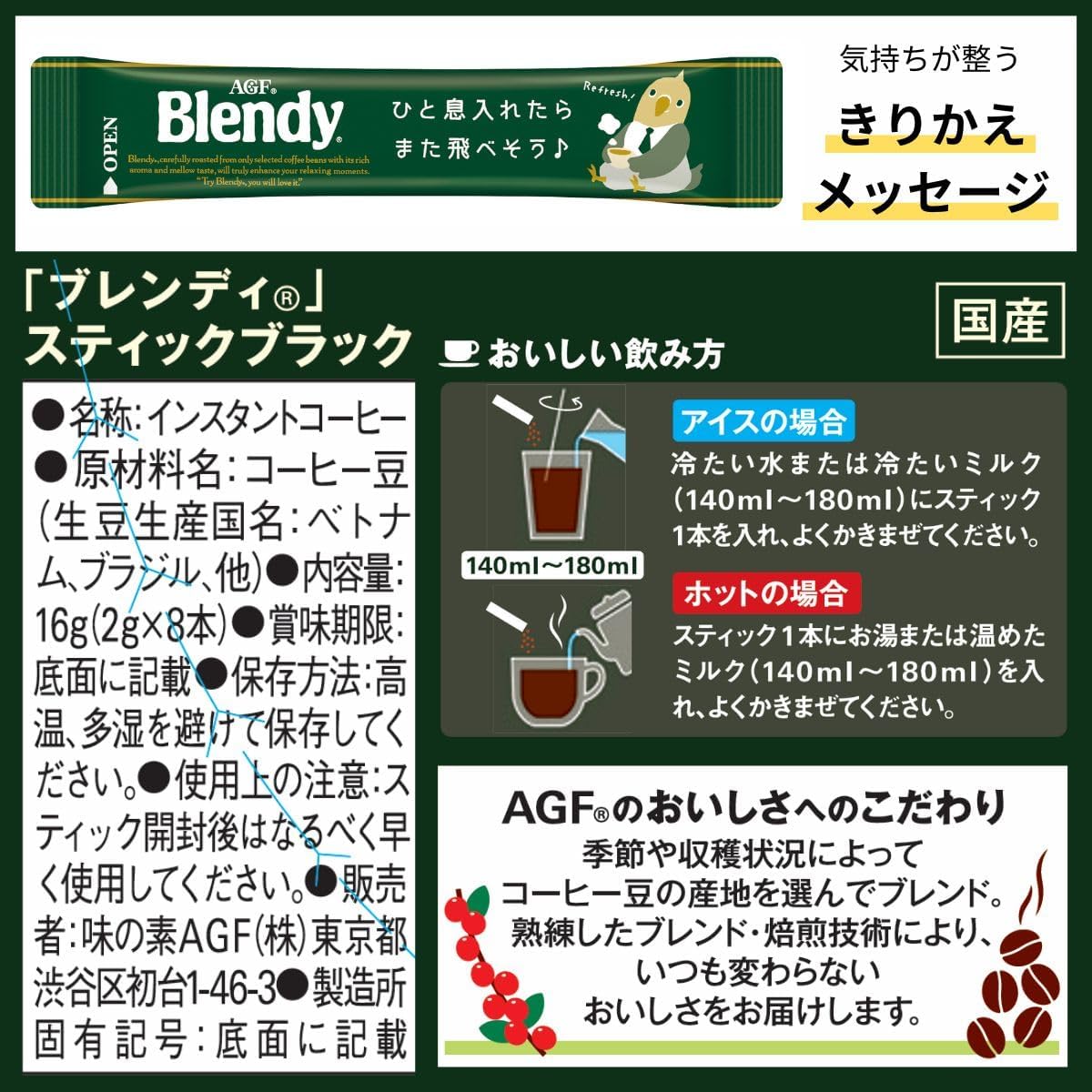 "咖啡厅是得意的。 搅拌。 "Blendy"中熟知的"Blendy"即时咖啡,通过独特的烘焙技术,可以享受醇厚的浓厚香味和香气。 采用在喷雾干燥制法中花费一些功夫的独创制法粉末,即使是冷水或牛奶(牛奶)也能轻松溶解,不仅适合热,也推荐用于冰咖啡或冰咖啡。 AGF(AGF) "Blendy" 黑 8 瓶是一款充满香味和醇厚的棒状即溶咖啡。 只需一瓶即可享受热咖啡和冰咖啡。 1杯一杯都很方便的独立包装棒咖啡(无黑色、无奶、甘甜)。 可以快速溶于冷水或牛奶,可以轻松享受冰咖啡和冰咖啡的棒状即时咖啡。 易于试用尺寸。 不仅可以搭配黑咖啡,也可以和棒状咖啡一起享受办公室和家庭的乐趣。 从咖啡豆的烘焙到填料都在国内工厂进行生产,配合细腻的日本味觉开发的一次性咖啡。