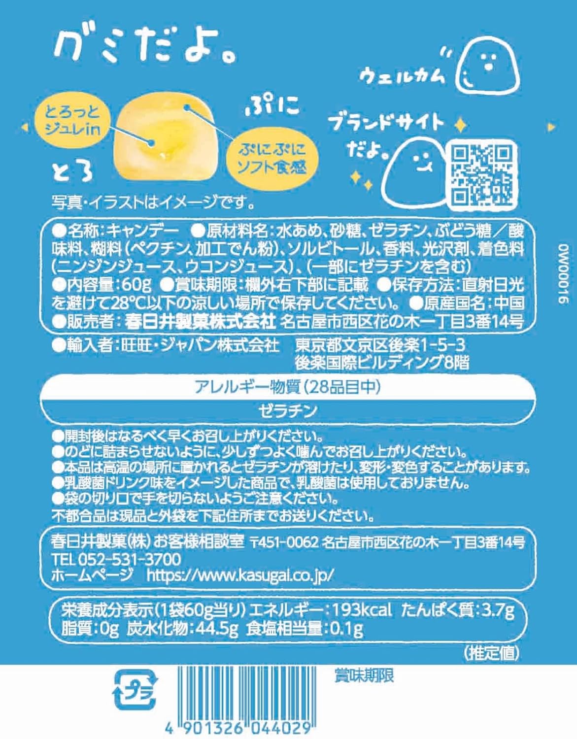 糖稀、砂糖、明胶、葡萄糖/酸味剂、糊剂(果胶、加工淀粉)、山梨糖醇、香料、光泽剂、着色剂(胡萝卜素、姜黄汁)、姜汁)、(部分含有明胶)