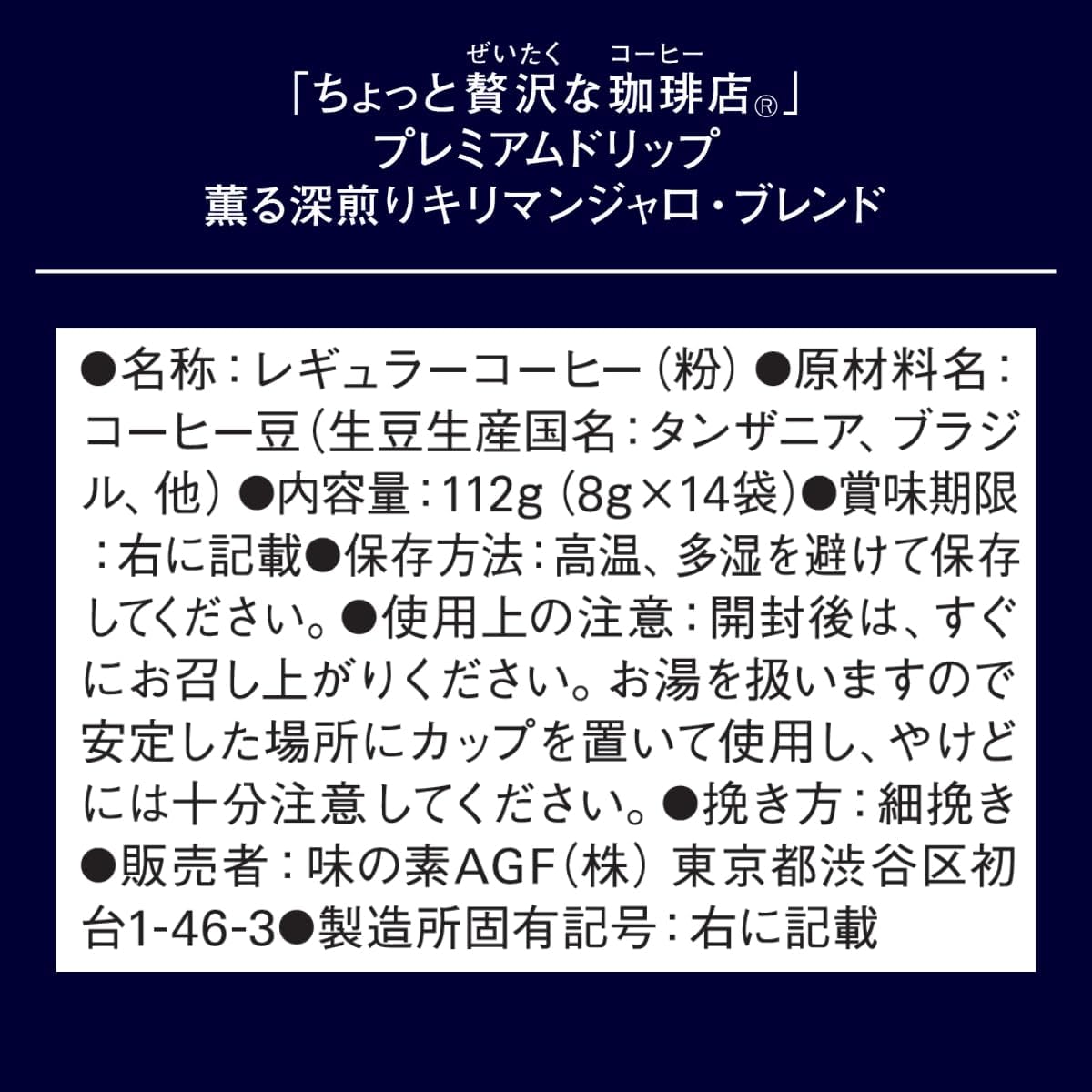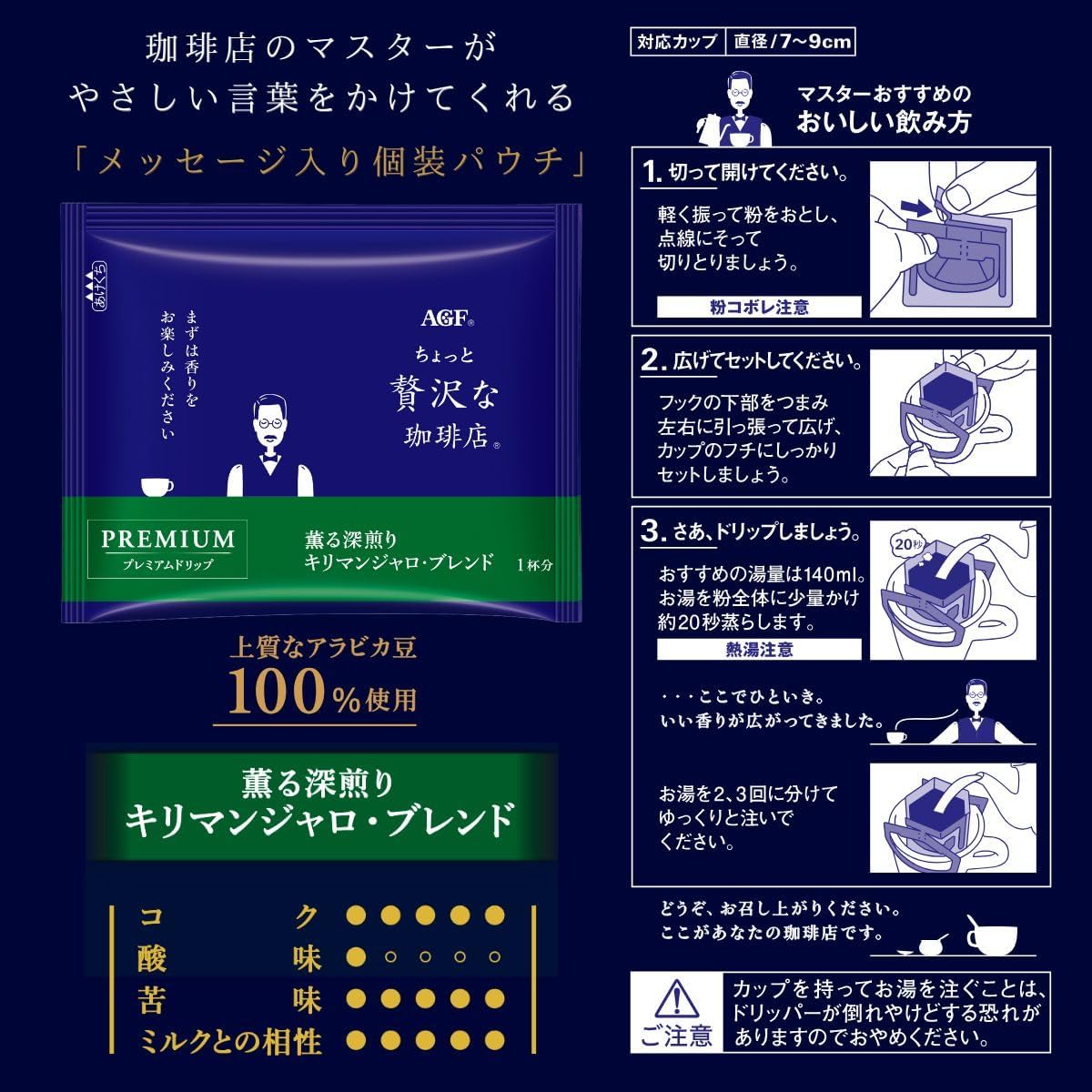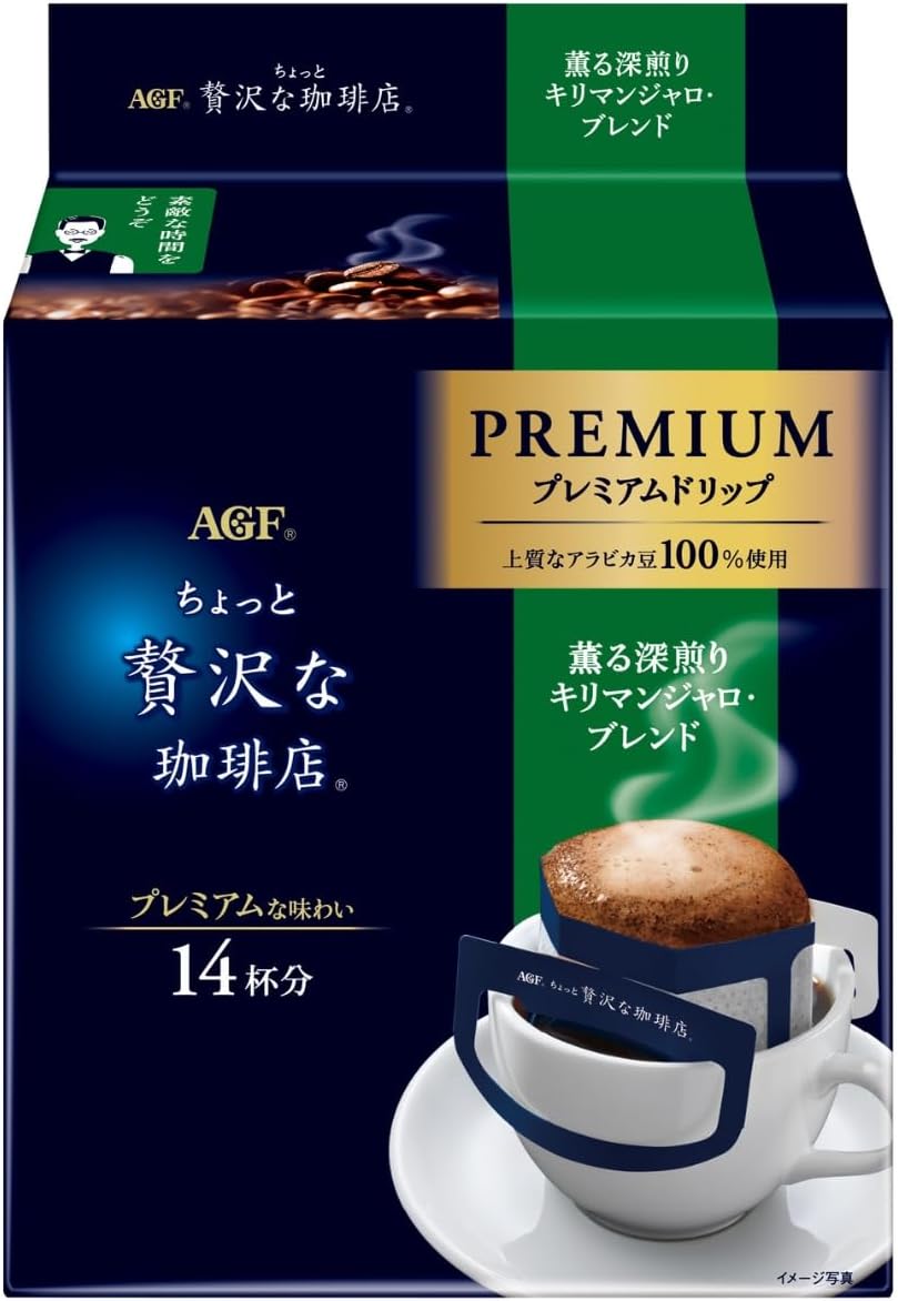 "散发香味,慢烘焙"。 "稍奢侈的咖啡店" 高级滴漏采用精选的优质阿拉伯咖啡豆100%,配合豆子的特点精心烘焙。 咖啡店的主打在手冲咖啡馆的香气高清澈的后味为特征的滴漏式咖啡。 AGF(AGF) "稍奢侈的咖啡店" 高级滴漏 香味深煎 Kyliman Jarro Blend 14袋采用精选的优质阿拉伯豆100%的坦桑尼亚基里曼贾洛豆大量混合。 其特点是强大的浓郁香味和香气,清爽后味道。 一杯一杯都很方便的独立包装滴滤袋,个人普通咖啡款。 高级滴漏,采用广的滤杯。 如同真正的手冲咖啡一般,让您享受高品质的咖啡。 从咖啡豆的烘焙到填充都在国内工厂进行生产,配合纤细的日本的味道开发。 不会妨碍任何人,希望慢慢地使用。 每天都能见到,虽然很纤细,但却很奢华。 适合这样的时刻的咖啡。
