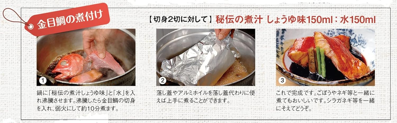 伊豆稻取渔港的人气食处,网元料理德造丸。 这款秘传炖煮煮甘甜的著名品金目鲷鱼煮鱼时使用的秘传的煮汁。 在金目鲷鱼的正宗场土的味道传承下来的炖菜味道,在家也能轻松制作。 将煮汁稀释至2倍,沸腾后将鱼煮约10分钟即可。 肉类、筑前煮、猪角煮、寿喜烧的倒刺等多种用途。