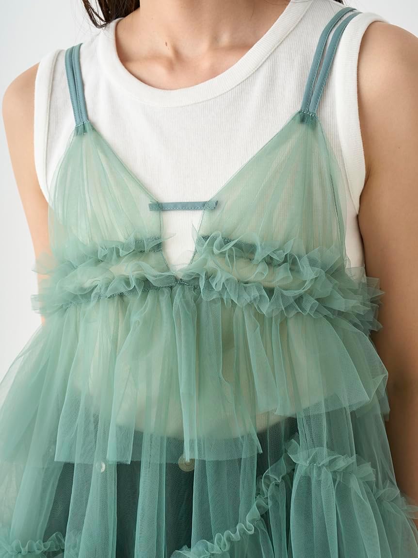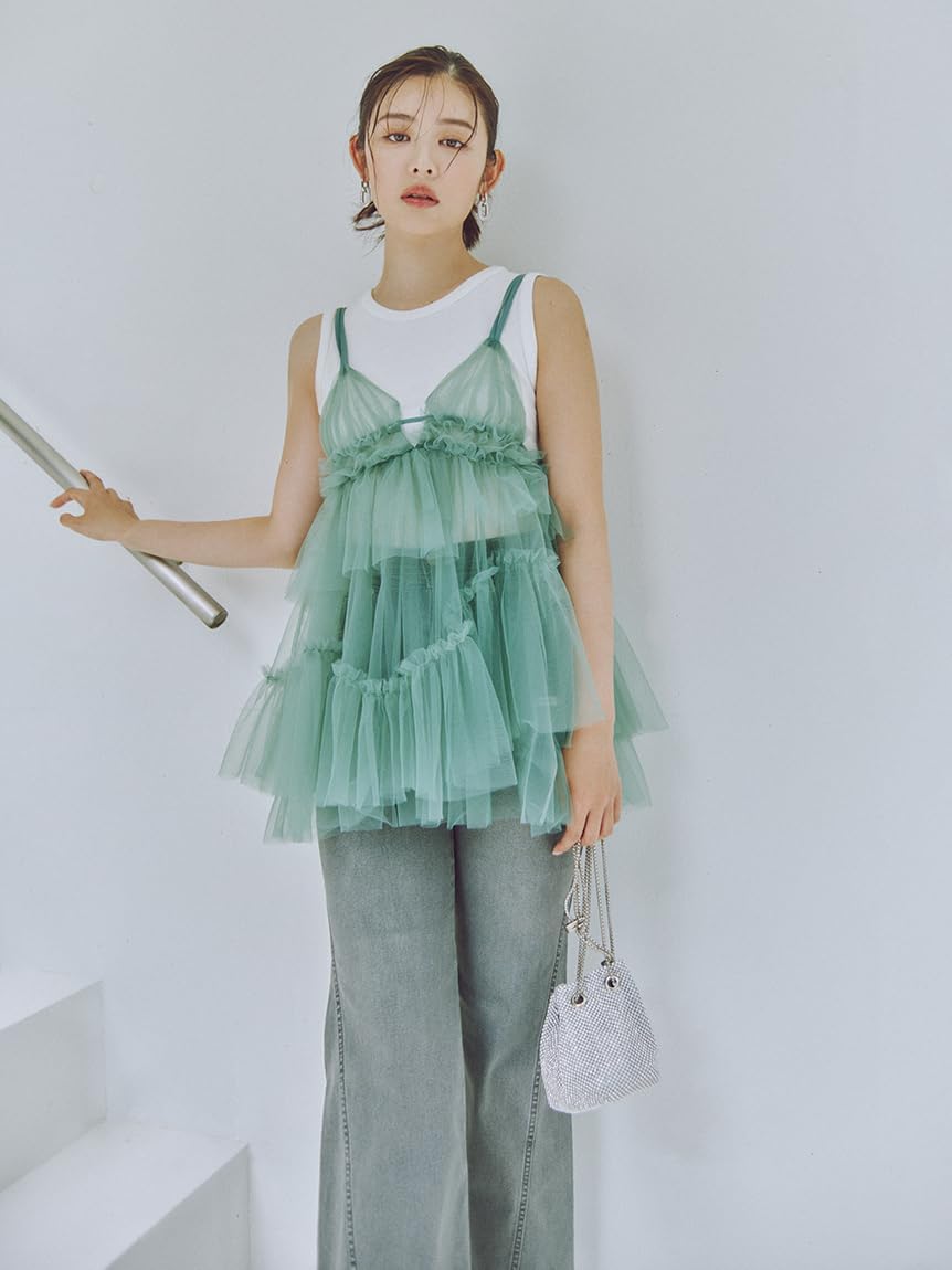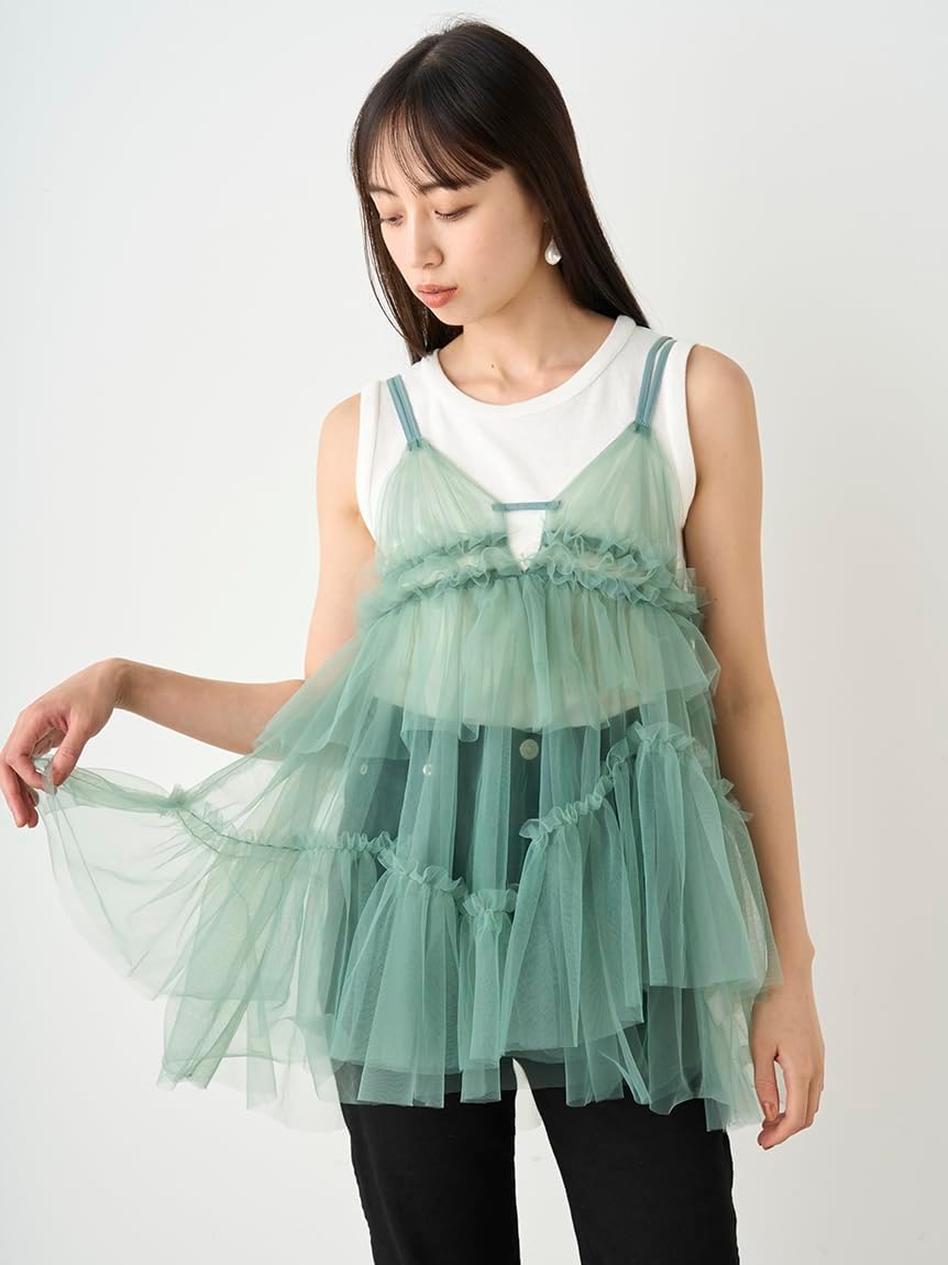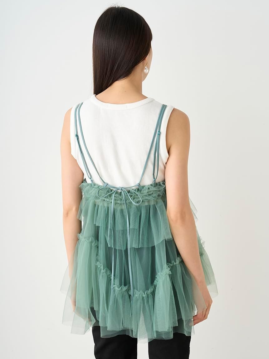 【薄纱 吊带上衣和针织衫盒的组合非常华丽】 [Design/Styling] 薄纱材质设计的吊带上衣和穿着舒适的针织衫盒套装。 吊带上衣使用充满透明感的美丽流行感的薄纱材质,束腰长度设计。 采用分层设计,轮廓突出重量,下摆不对称,给人时尚的印象。 后背不经意间的细蝴蝶结增添了可爱感。 不仅可以搭配配套背心,也可以搭配现有的衬衫。 背心采用具有休闲感的单品,可以享受与束腰搭配的MIX。 [面料] 共有灰色、薄荷色、粉色米色3种颜色。 灰色为灰色坦克搭配黑色吊带上衣。 薄荷色为白色坦克搭配薄荷色的吊带上衣。 粉色米色为米色坦克搭配粉色米色吊带上衣。 吊带上衣的肩带长度可以调节。 吊带上衣是具有伸缩性且穿着舒适的材料。 透明感:略有 里料:无 弹性:微弹 光泽感;无 面料厚度:普通 【推荐骨骼型】 ■骨骼直筒 ■骨骼波浪 ■骨骼自然