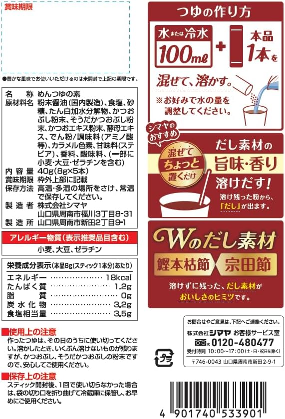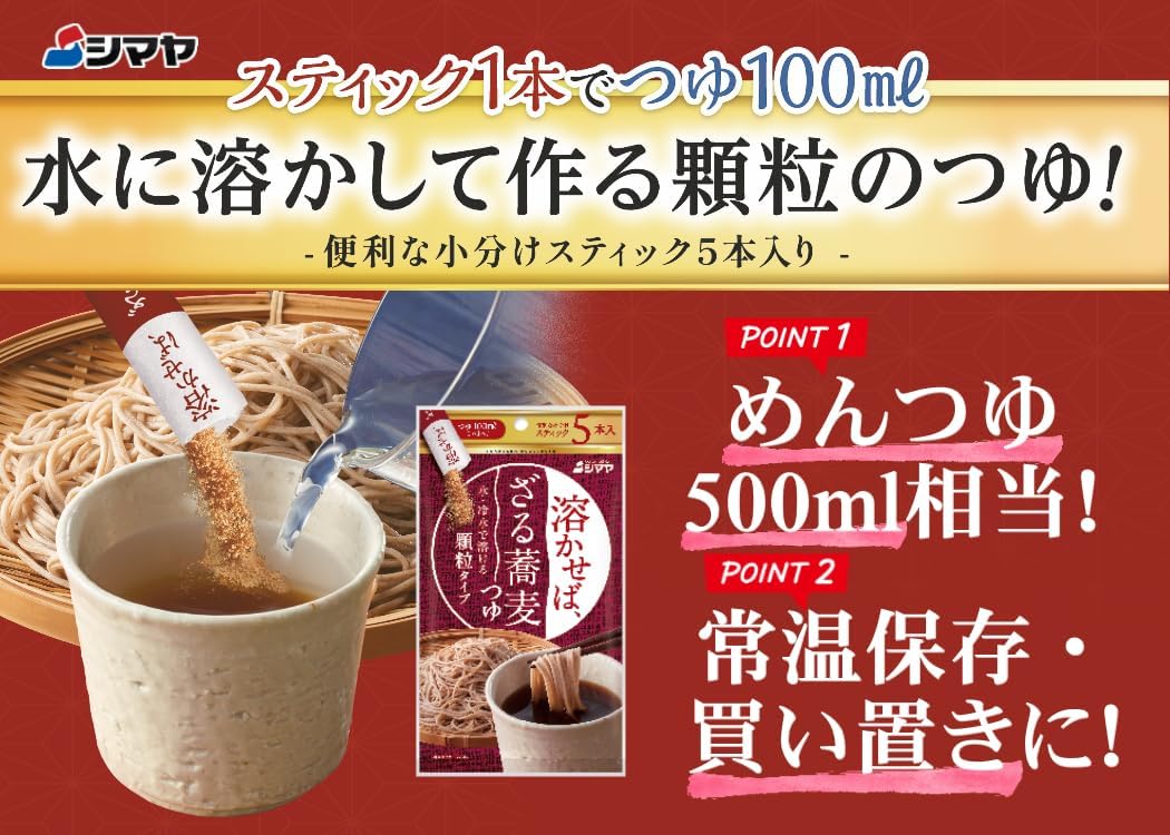 溶于水后制成的颗粒状笊篱。 只需1支棒就能变成100毫升,可根据喜好调整浓稠、量。 ●轻便易携带,因为可以在家里使用,所以可以广泛用于便当、户外、露营等各种场合。 使用鲣鱼干干干节粉末、宗田鲣鱼干粉末,具有良好的汤汁感和美味,有着酱油的味道,与荞麦风味相得益彰。