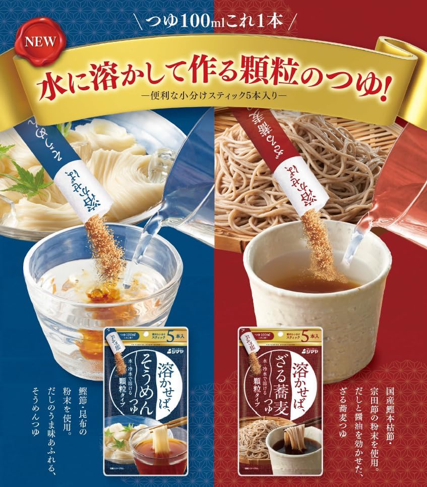 溶于水后制成的颗粒状笊篱。 只需1支棒就能变成100毫升,可根据喜好调整浓稠、量。 ●轻便易携带,因为可以在家里使用,所以可以广泛用于便当、户外、露营等各种场合。 使用鲣鱼干干干节粉末、宗田鲣鱼干粉末,具有良好的汤汁感和美味,有着酱油的味道,与荞麦风味相得益彰。