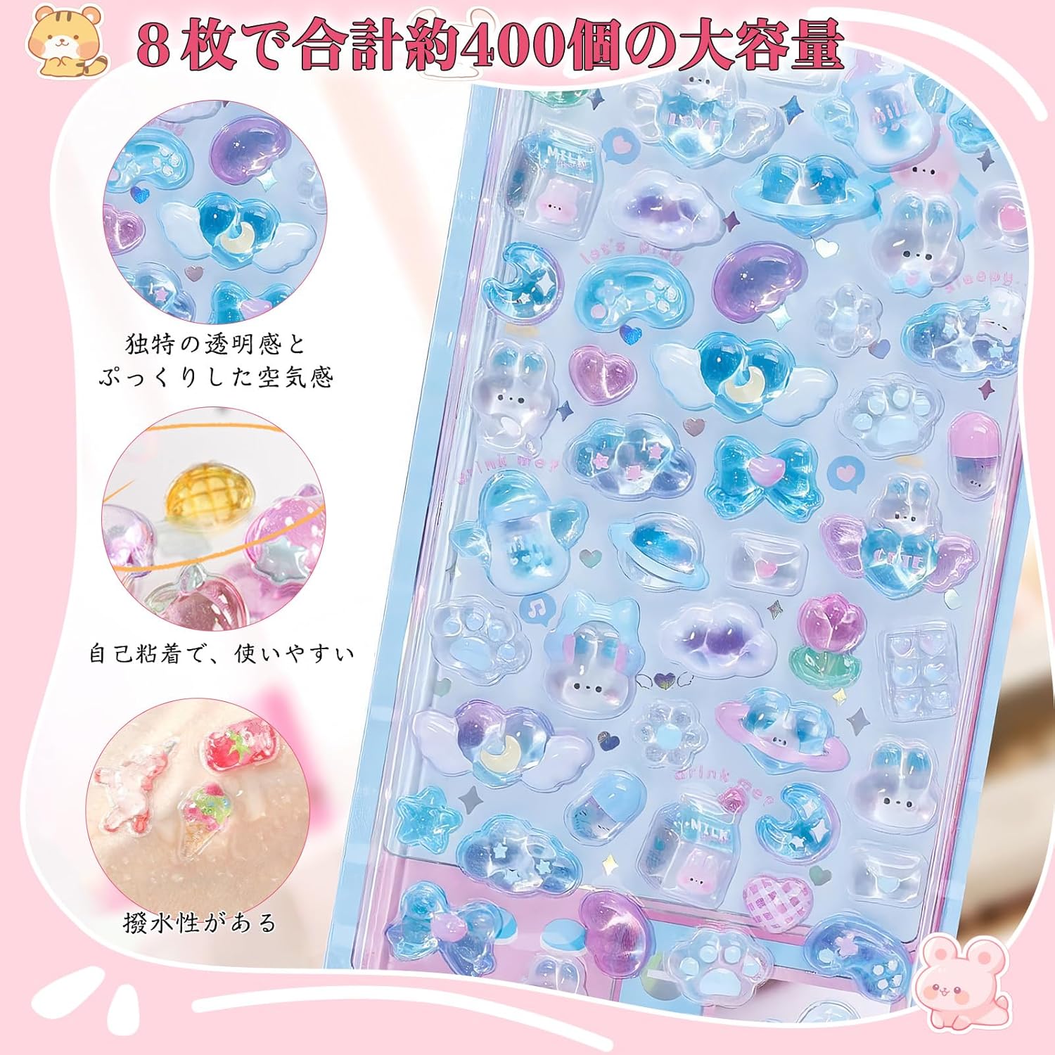 图案いちご、ねこ、食べ物、月、パン、熊、おにぎり、恐竜、魚、おばけ、うさぎ、パンダ、ぷくぷく