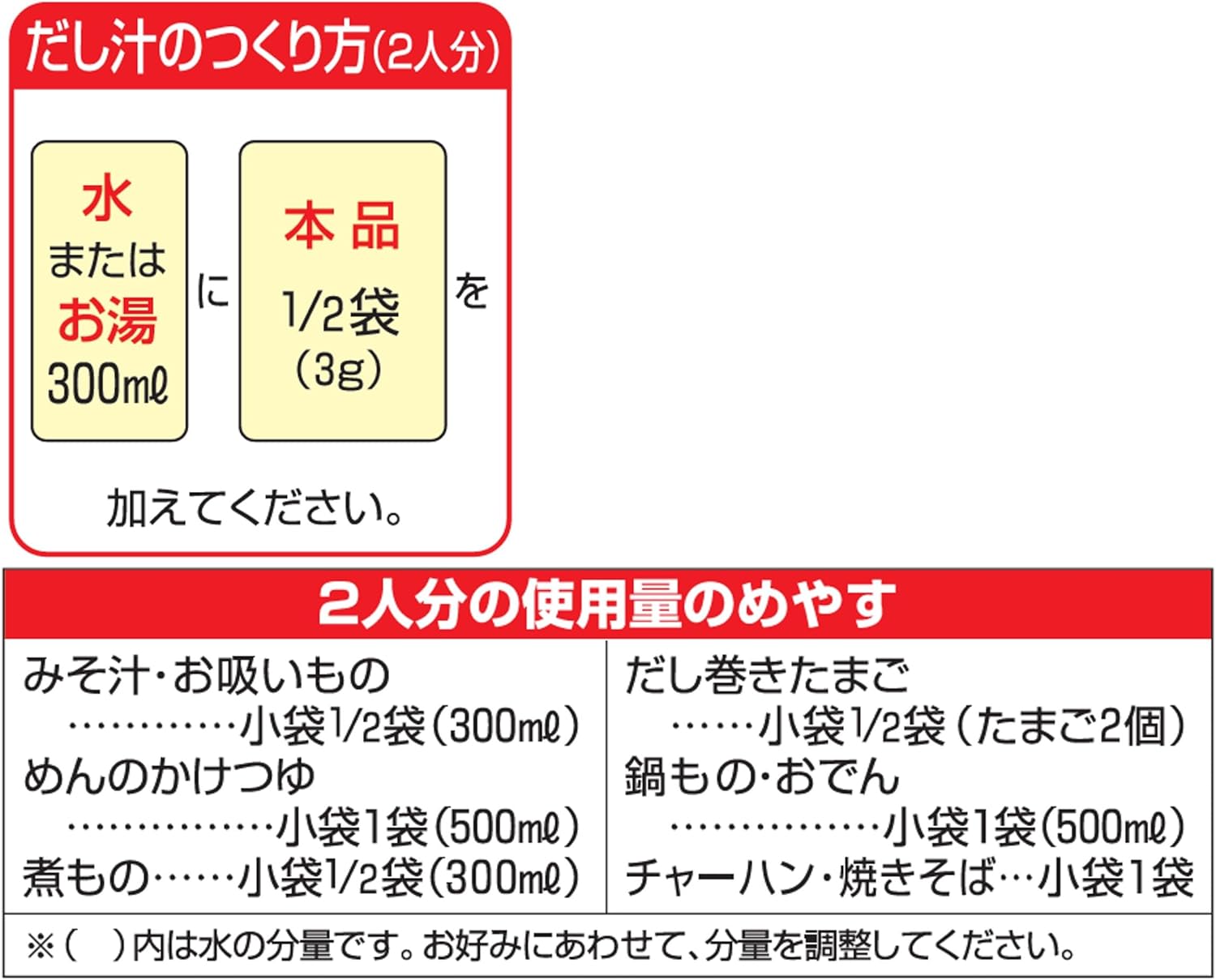 不添加化学调味料,温和淡盐的味道,充分发挥汤汁的味道。 枕崎产鲣鱼干香味的高味道,均衡搭配北海道产海带浓厚的口感。 因为是粉末型,所以使用起来很方便,在材料上可以轻松地融入各种料理中。