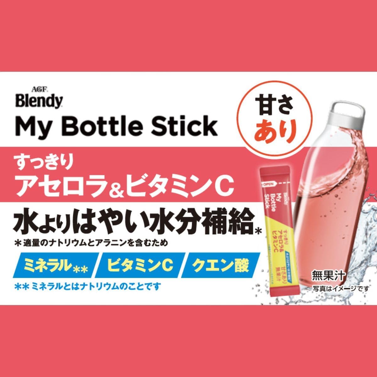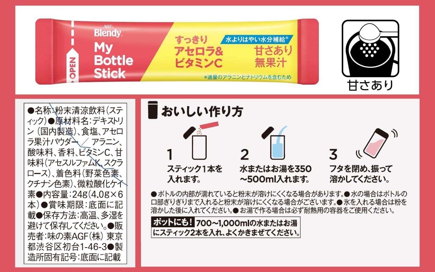 "Blendy" My Bottle Stick,只需放入1支水或热水,就能享受1天的个人瓶大小的粉末饮料。 1瓶棒350毫升~500毫升的喷雾瓶。 实现了"使用塑料的环保性"、"比塑料瓶、罐装饮料更经济"、"高水溶性粉饼可以立即使用",支持生态和智能生活。 AGF(AGF) "Blendy" My Bottle Stick 清爽西印度樱桃&维生素C 6瓶,是一款适合个人水瓶的食谱,只需用水搅拌就能马上使用的粉末型西印度樱桃饮料。 通过舒适的甘酸,让心情焕然一新。 配合一种氨基酸的丙氨酸和钠,帮助水快速补充水分。 含有盐分、维生素C、柠檬酸。 一次一次就很方便的独立包装棒型。 冷水的"秒溶",可以轻松地去除垃圾。 可放入平时使用的瓶子或水杯(不锈钢除外)、便携式水杯、水杯等水杯中携带。 应对中暑(1瓶350ml~500ml)。 ※热饮时请使用耐热的瓶子。