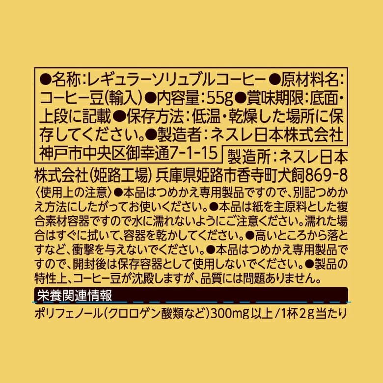 【名称】: 常规款咖啡 净含量: 55克×12 【保存方法】: 请保存在低温或干燥的地方。 保质期: 每一个产品都有印字。 【原材料名称】: 咖啡豆(进口)