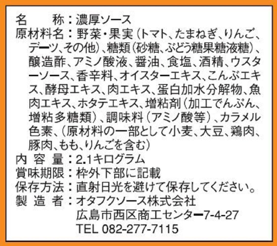 蔬菜、果实(番茄、洋葱、苹果、酱汁、其他)、糖类(砂糖、葡萄糖果液体糖)、酿造醋、胺基酸液、食盐、淀粉、酒精、酱油(酿造)、乌斯特酱、香辛料、油汁提取物、马士革、酵母提取物肉提取物、昆布、扇叶提取物、牡蛎提取物、蛋白水解物、调味料(氨基酸等)、焦糖色素、增稠多糖类(原材料的一部分小麦、大豆、鸡肉、猪肉。 (含苹果)