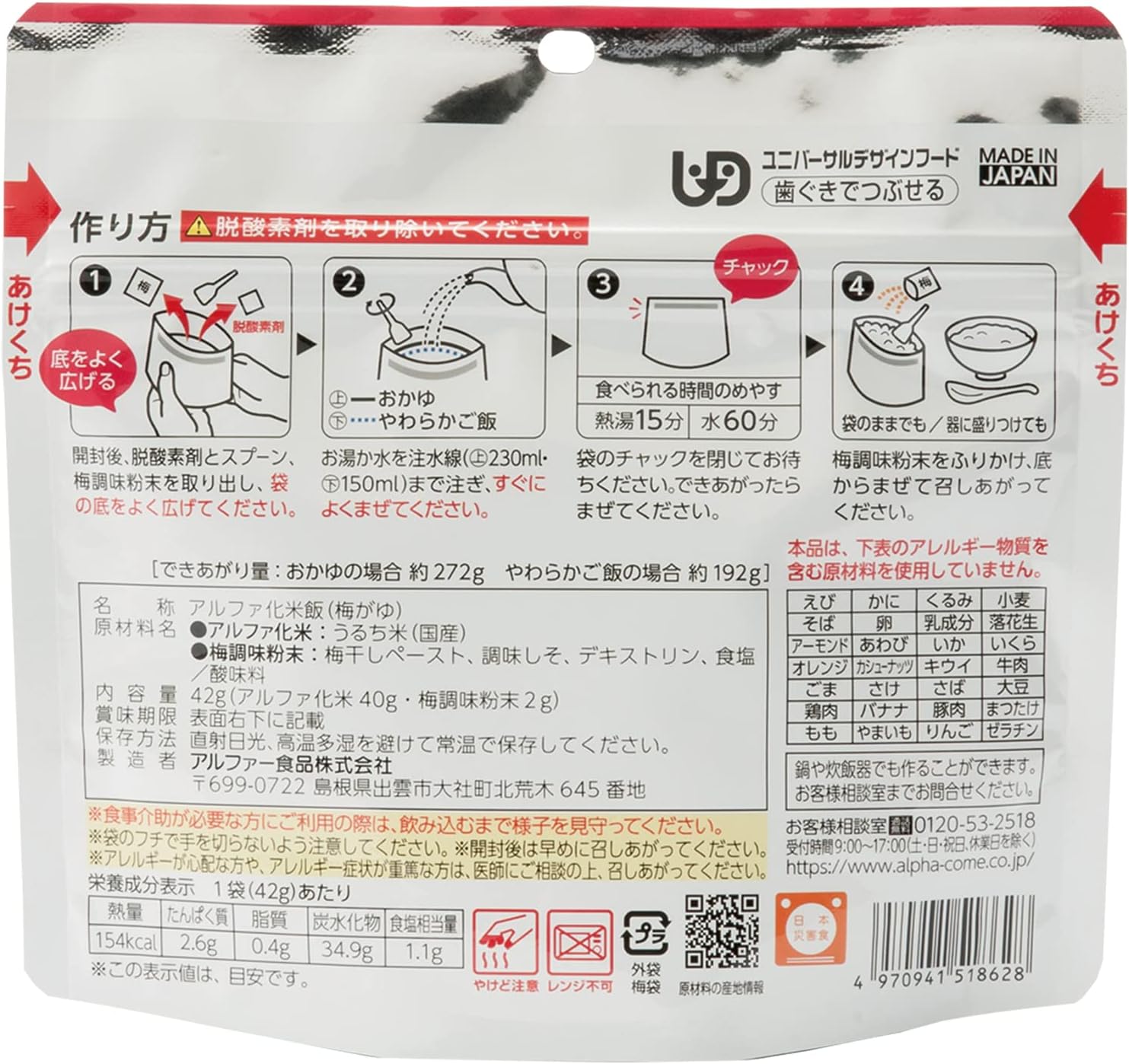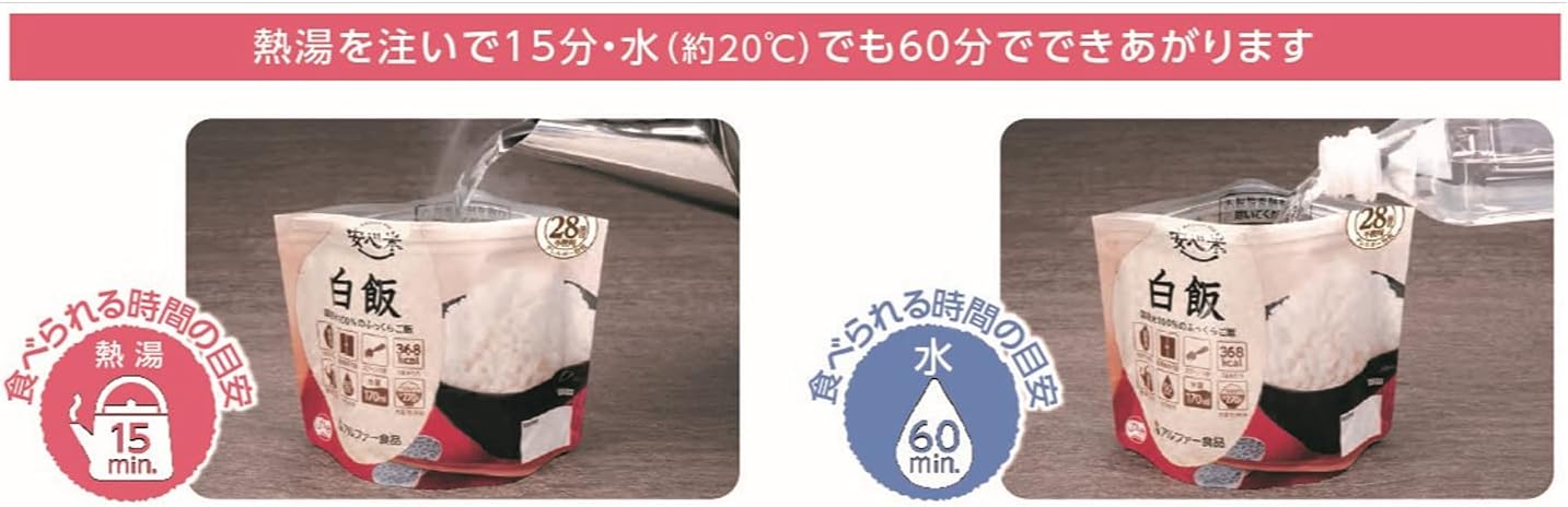 ※保存期为从制造日开始。 根据商品的不同,可能需要时间变短。 ※请避免存放在阳光直射及高温多湿,存放,具有挥发性的物质(汽油、灯油等)。 倒入热水前,请清除脱氧剂。 ※商品包装、规格、价格等如有变更,恕不另行通知。 请避免阳光直射、高温多湿,常温保存。 担心大米过敏或过敏症状严重的人士,请咨询医生后食用。 开封后请尽快食用。 ※请注意不要用袋子的边缘剪掉。