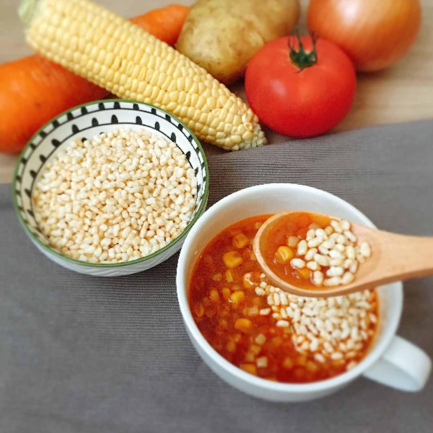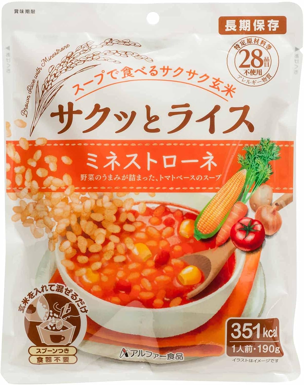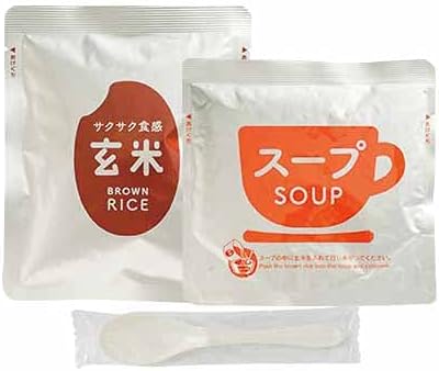 酥脆的米饭是"糙米"与"汤"一起吃的米饭套装。 本品为糙米、汤、汤匙的套装,可直接食用汤袋,无需餐具。 玄米使用100%日本产糯糙米。 保质期为从生产日起5年6个月,常温长期保存。 在番茄的汤中,使用土豆、洋葱、甜玉米、胡萝卜,与蔬菜的美味矿物质一起品尝,享受酥脆的糙米。 对于不使用特定原材料(过敏物质)28种,对食物过敏人士而言,是最适合紧急饮食的长期保存食品。