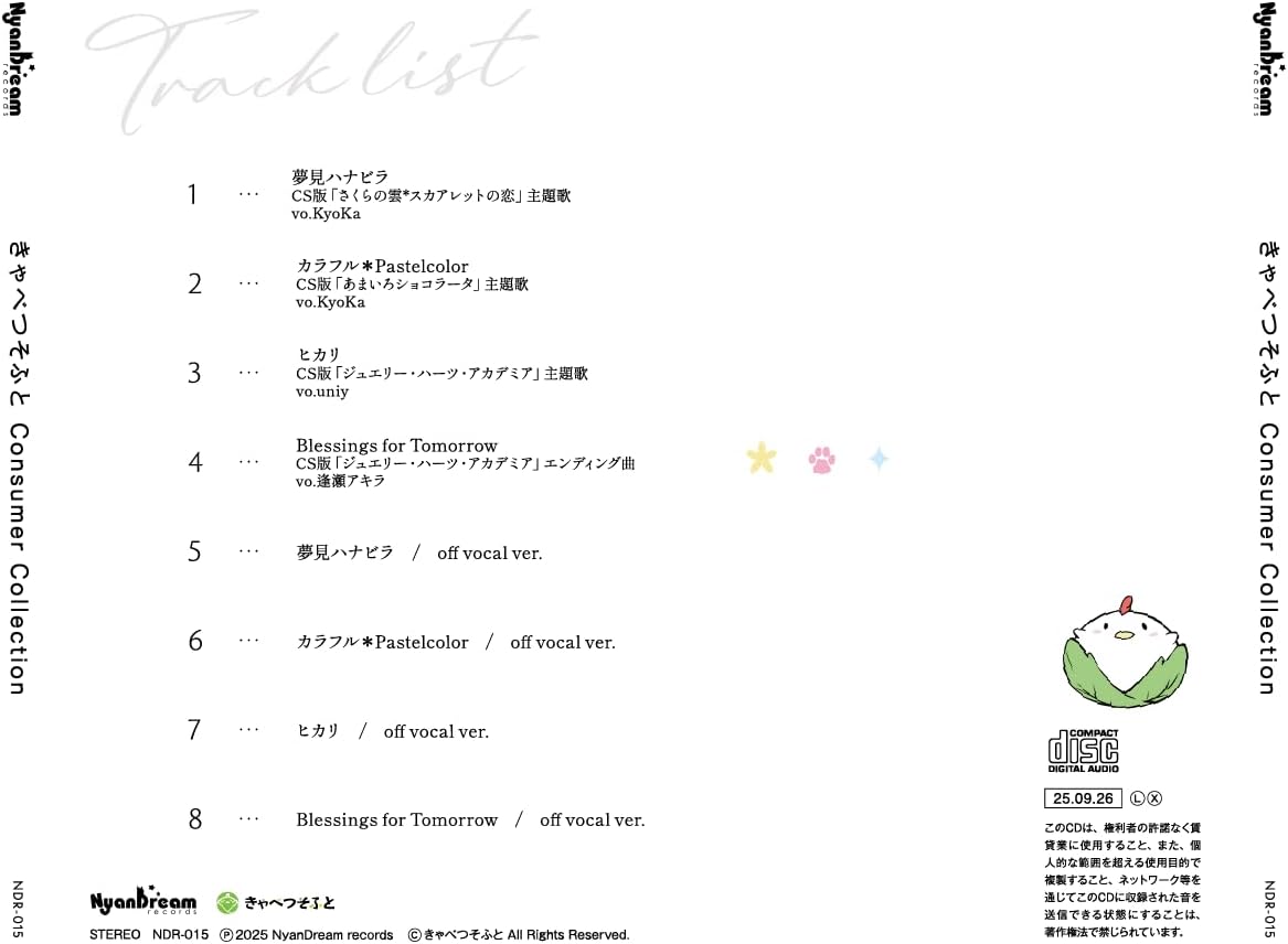 汇集了卡通人物的音乐版的迷你相册发售! 夹克上绘为绘图的宝石之花/珠宝娜"玛亚"。 <收录曲> 1.梦见香草 CS版"樱之云*斯卡哈雷特之恋"主题曲 vo.KyoKa 2.多彩*Pastelcolor CS版"蓝色巧克力"主题曲 vo.KyoKa 3.HIKAI CS版"珠宝·心形·学院 OP vo.uniy 4.Blessings for Tomorrow CS版"珠宝·心形·学院"ED vo.逢濑 5.梦见HUNAVIA(off vocal ver.) 6.彩色*Pastelcolor(off vocal ver.) 7.HIKARI(off vocal ver.) 8.Blessings for Tomorrow(off vocal ver.)