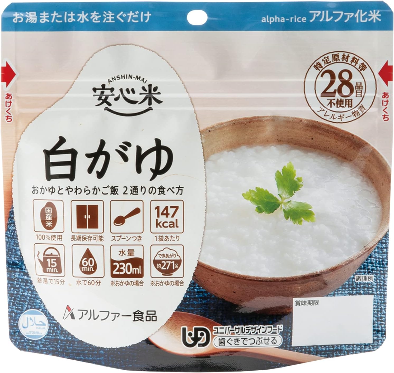 采用特定原材料等(过敏物质)28种不使用眼睛的食物过敏性的长期保存食品。 使用日本产米100%。 可以进行"粥"和"软饭"2种食用方法。 为了根据自己的喜好进行拌,我们将盐一同包装。 内容量/41g⇒可迅速调节量/271g(做粥时)・191g(使用软米饭时) 只需注入热水或水即可轻松烹饪。 (热水15分钟、水(20℃)60分钟) 无需餐具:因为里面放入汤匙,袋子就会变成容器,所以可以直接食用。 设计特制:从生产日起保存5年。 轻便小巧,便于携带,收纳性优异。 Rolling Stick是什么? :日常吃紧急食物,吃完后可重复购买,是一款家庭储备的方法。 "如果介意的话,保质期会大幅变大"的失败的同时,可以提供适合食用的物品。 安心米各种菜肴,烹饪也很简单! 适合户外、露营等平时使用,也适合作为骑行服。 ※日本灾害食品学会认证·苯乙烯认证以及通用设计食品"可以压扁牙龈"认证商品 ISO22000、FSSC22000认证工厂制造。 蛋白质3.0克、脂质0.3克、碳水化合物33.1克、食盐相当量1.0克(每袋)