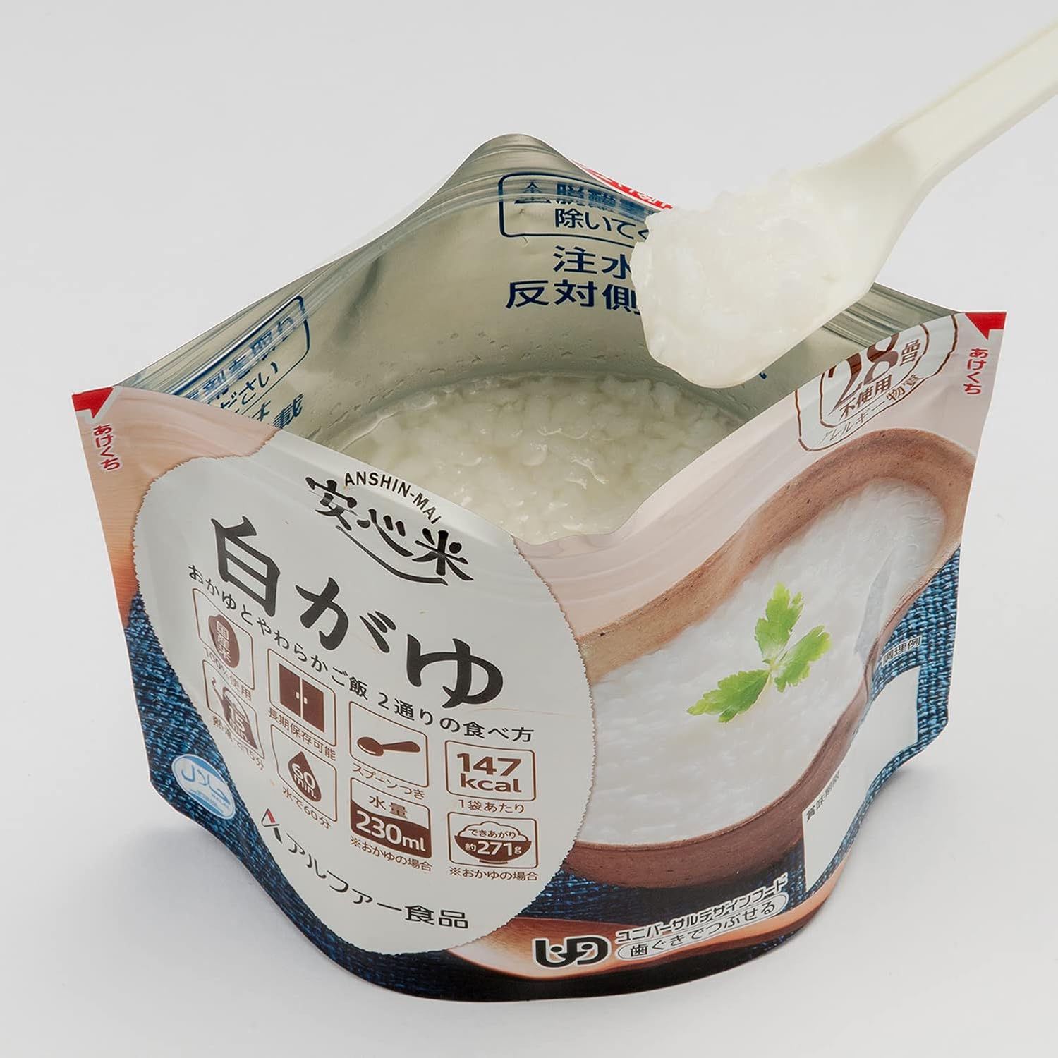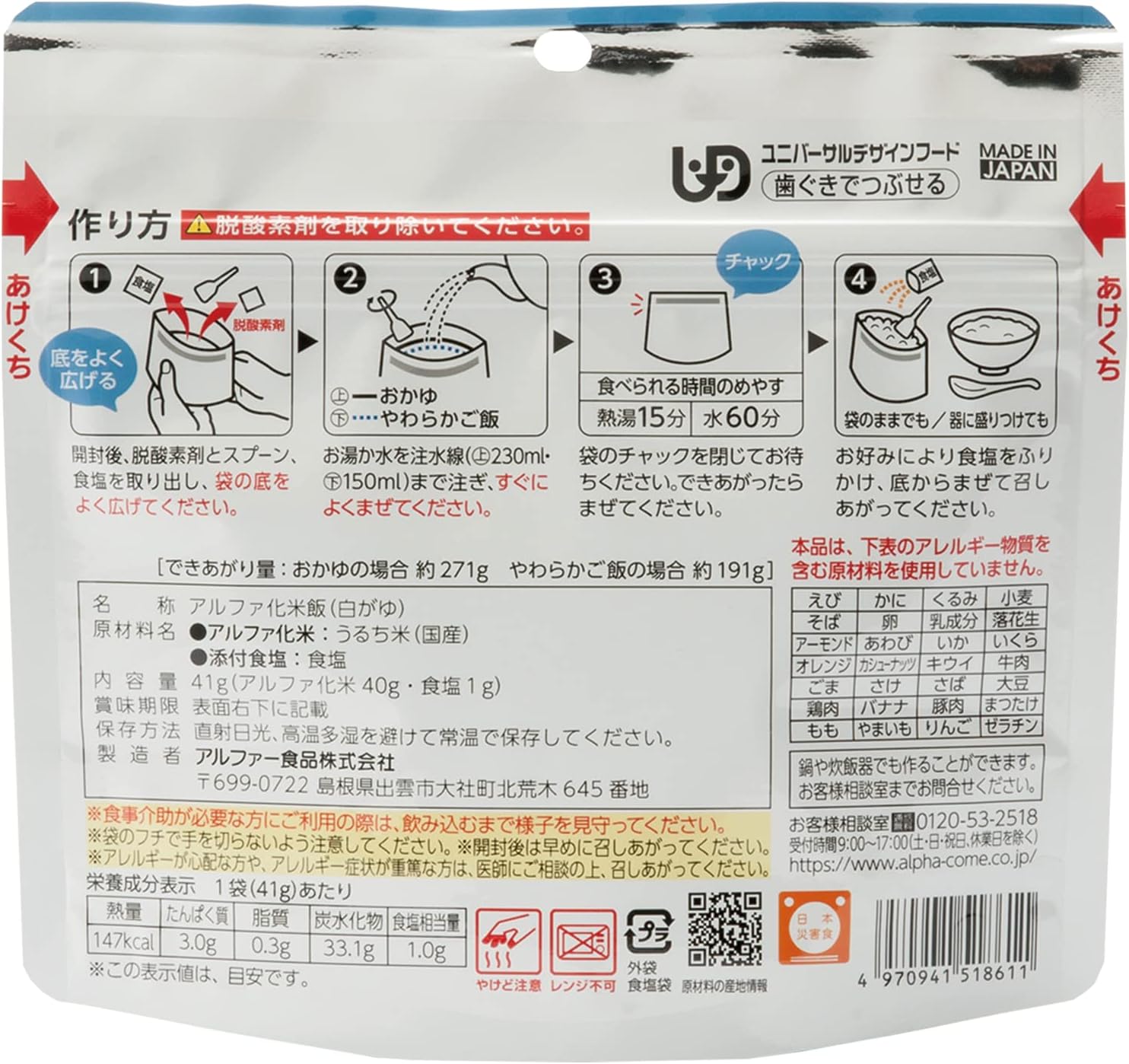 采用特定原材料等(过敏物质)28种不使用眼睛的食物过敏性的长期保存食品。 使用日本产米100%。 可以进行"粥"和"软饭"2种食用方法。 为了根据自己的喜好进行拌,我们将盐一同包装。 内容量/41g⇒可迅速调节量/271g(做粥时)・191g(使用软米饭时) 只需注入热水或水即可轻松烹饪。 (热水15分钟、水(20℃)60分钟) 无需餐具:因为里面放入汤匙,袋子就会变成容器,所以可以直接食用。 设计特制:从生产日起保存5年。 轻便小巧,便于携带,收纳性优异。 Rolling Stick是什么? :日常吃紧急食物,吃完后可重复购买,是一款家庭储备的方法。 "如果介意的话,保质期会大幅变大"的失败的同时,可以提供适合食用的物品。 安心米各种菜肴,烹饪也很简单! 适合户外、露营等平时使用,也适合作为骑行服。 ※日本灾害食品学会认证·苯乙烯认证以及通用设计食品"可以压扁牙龈"认证商品 ISO22000、FSSC22000认证工厂制造。 蛋白质3.0克、脂质0.3克、碳水化合物33.1克、食盐相当量1.0克(每袋)