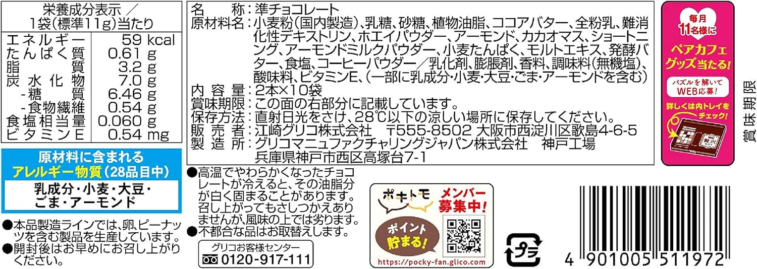 小麦粉(国内制造)、乳糖、砂糖、植物油脂、可可油、全脂奶粉、乳清粉、难消化性糊精、杏仁、起酥油、杏仁牛奶粉、小麦蛋白、麦芽提取物、可可块、发酵黄油、食盐、咖啡粉/乳化剂、膨胀剂、香料、调味料(无机盐)、维生素E、(部分含有牛奶成分、小麦、大豆、芝麻、杏仁)。