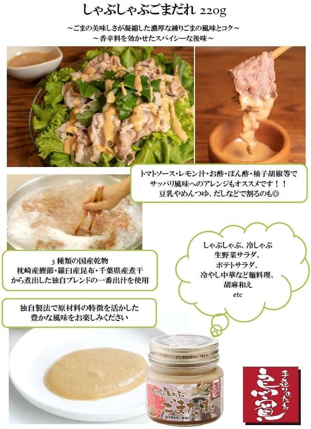 将作为健康食品也备受关注的白胡麻精心揉捏,做成了糊状物。 配合了丰富浓郁的白胡麻的美味和香气的产品。 浓郁的白胡麻的丰富口味,从"罗臼海带"、"枕崎鲣鱼节"、"国产煮干"开始花费时间。 配合煮出的自家制造汤,添加了鸟宽特有的美味。 稍微有点辣椒,紧缩了味道。 本产品是一款由白胡麻本来的"味道"、"香味"、"色彩"引以为傲的单品。 不使用增稠剂、染色剂、防腐剂、稳定剂。 特点 由于白胡麻的浓度较高,所以材料本身的颜色非常漂亮。 内部部分的分离很显眼,但是由于这是胡麻的固体和汤汁的分离, 使用上的问题。 此外,由于它不会倾斜,因此也可以像干净的勺子一样, 请仔细搅拌后再使用。 使用方法 虽然可以直接食用,但是用自己喜欢的水变淡、甜料酒、出汁、醋等分割 可以做出美味。