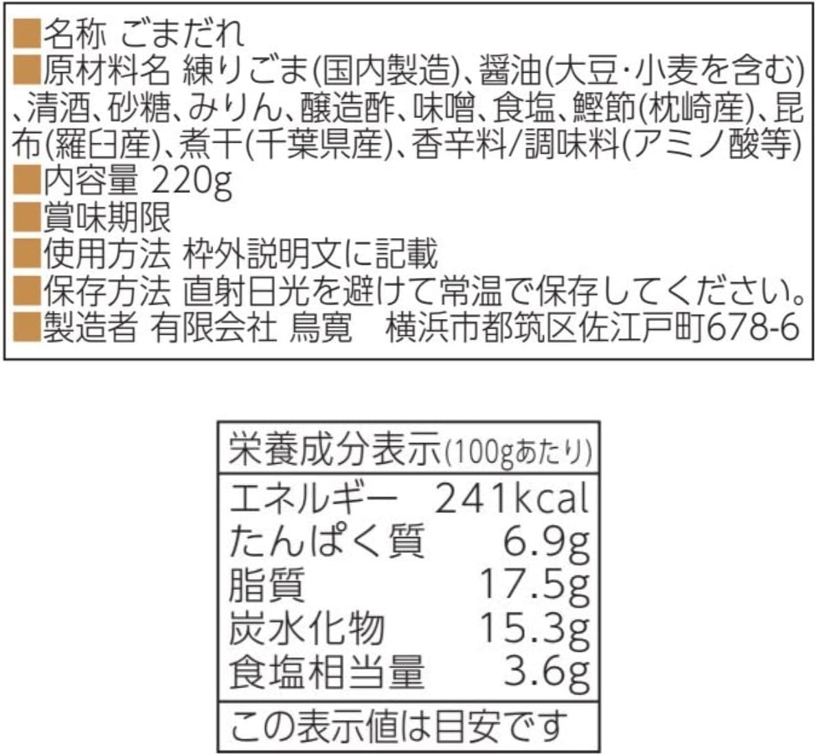 将作为健康食品也备受关注的白胡麻精心揉捏,做成了糊状物。 配合了丰富浓郁的白胡麻的美味和香气的产品。 浓郁的白胡麻的丰富口味,从"罗臼海带"、"枕崎鲣鱼节"、"国产煮干"开始花费时间。 配合煮出的自家制造汤,添加了鸟宽特有的美味。 稍微有点辣椒,紧缩了味道。 本产品是一款由白胡麻本来的"味道"、"香味"、"色彩"引以为傲的单品。 不使用增稠剂、染色剂、防腐剂、稳定剂。 特点 由于白胡麻的浓度较高,所以材料本身的颜色非常漂亮。 内部部分的分离很显眼,但是由于这是胡麻的固体和汤汁的分离, 使用上的问题。 此外,由于它不会倾斜,因此也可以像干净的勺子一样, 请仔细搅拌后再使用。 使用方法 虽然可以直接食用,但是用自己喜欢的水变淡、甜料酒、出汁、醋等分割 可以做出美味。