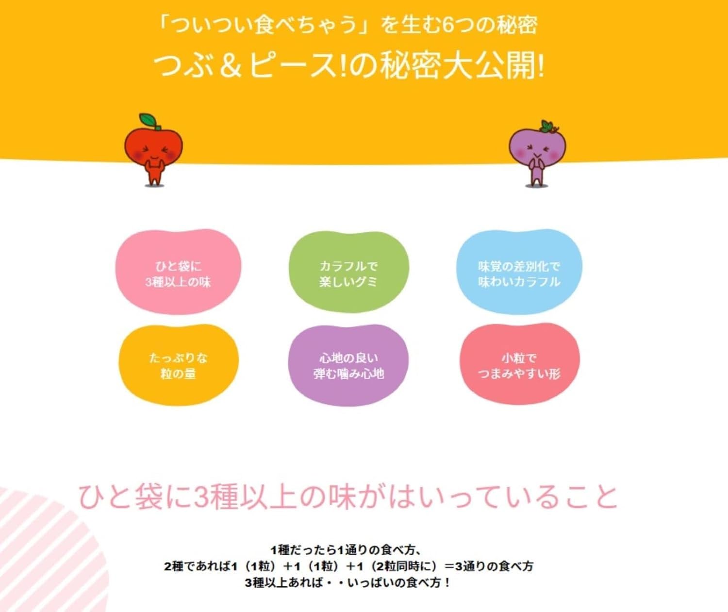砂糖(泰国制造、国内制造)、糖稀、明胶、乳糖、浓缩果汁(葡萄、葡萄柚、葡萄柚、桃子)/山梨糖醇、酸味剂、香料、凝胶剂(果胶)、阿拉伯胶、着色剂(红花黄、栀子黄色素、胡萝卜素)、光泽剂、乳化剂、(部分含有乳成分、大豆、大腿、苹果、明胶)。