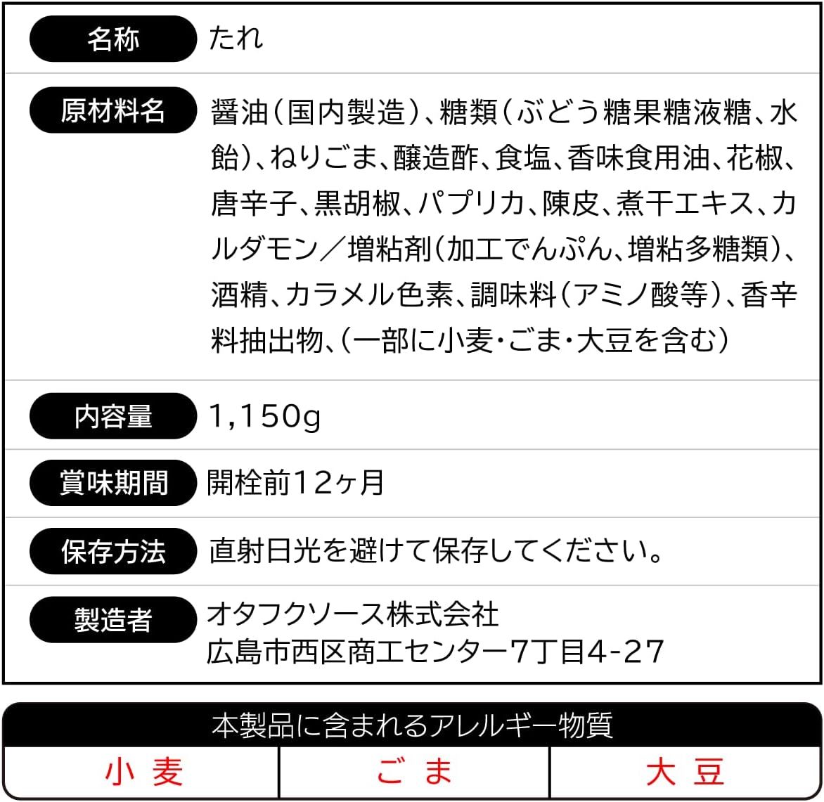 原材料:酱油(日本制造)、糖类(葡萄糖果糖液糖、麦芽糖)、葱芝麻、酿造醋、食盐、香味食用油、花椒、辣椒、黑胡椒、辣椒、陈皮、煮干提取物、豆蔻/增稠剂(加工淀粉、增粘多糖类)、酒精、焦糖色素、调味料(氨基酸等)、香辛料提取物、(部分部分含有小麦、芝麻、大豆)。