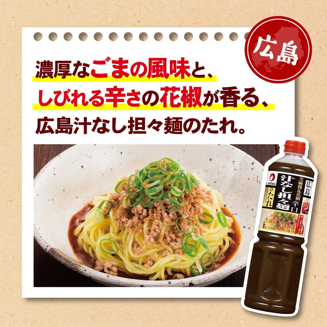 浓厚的芝麻风味和花椒香的广岛汤无担面酱。 配合风味丰富的"芝麻(芝麻)",配合了芝麻风味和浓郁的浓厚口感,同时使用2种花椒原料,再现了独特的甘甜。 为了满足顾客意见和需求,我们一滴一滴精心制作而成,我们致力于让顾客感到满意的商品。