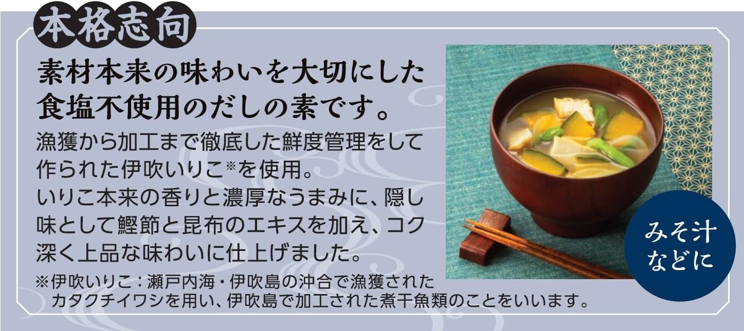 从渔获到加工都彻底的鲜度管理而制成的濑户内海伊吹岛的"伊吹IRIKO"(※)是一大特点是高雅而浓郁的美味。 浓稠的香气和浓郁的口感,加上鲣鱼干和海带精华,口感浓郁而优雅。 环保,使用减少塑料的使用量的纸质包装。 无添加成分的颗粒型。 ※伊吹鲑鱼:使用濑户内海・伊吹岛的冲合捕获的鱼,在伊吹岛加工的煮干鱼类。