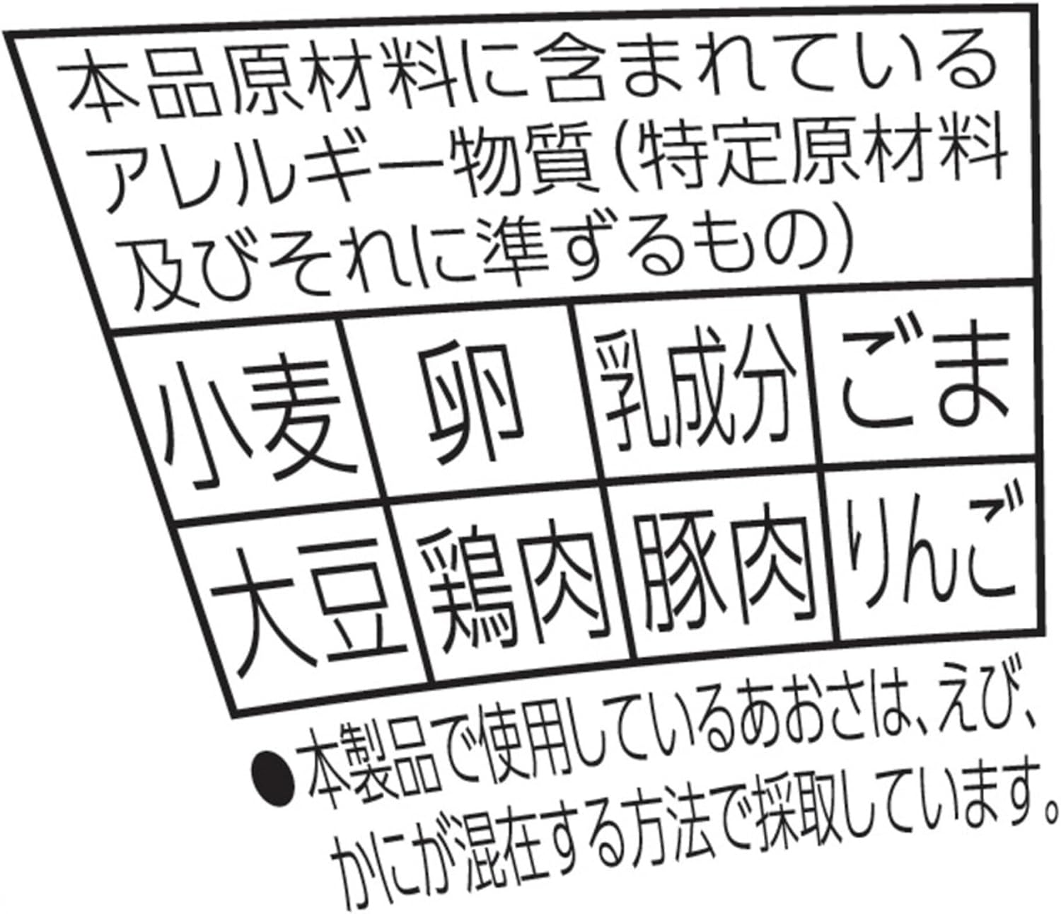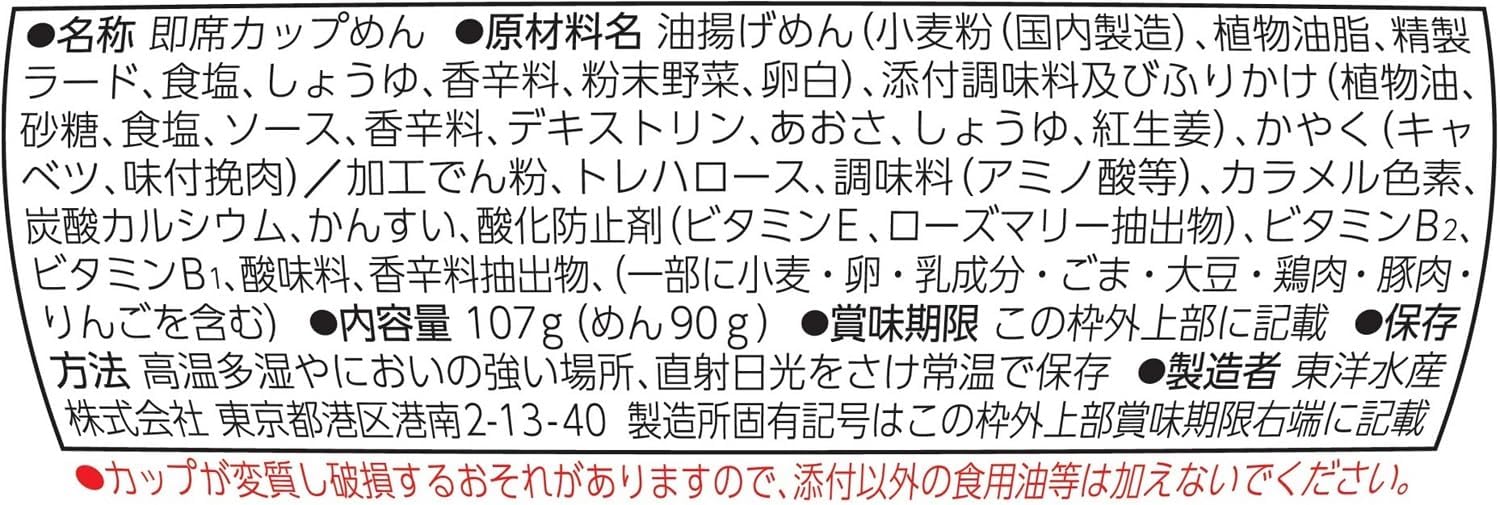 油炸面(小麦粉(国内制造)、植物油脂、精制猪、食盐、酱油、香辛料、粉末蔬菜、蛋白)、调味料及拌饭(植物油、砂糖、食盐、酱汁、香辛料、糊精、あお、酱油、红生姜)、加佐料(卷心菜、调味研磨肉)/加工淀粉、海藻糖、调味料(氨基酸等)、焦糖色素、碳酸钙、碱水、抗氧化剂(维生素E、迷迭香提取物)、维生素B2、维生素B1、酸味剂、香辛料提取物、(一部分小麦・鸡蛋 ・乳成分・芝麻・大豆・鸡肉・猪肉・苹果)