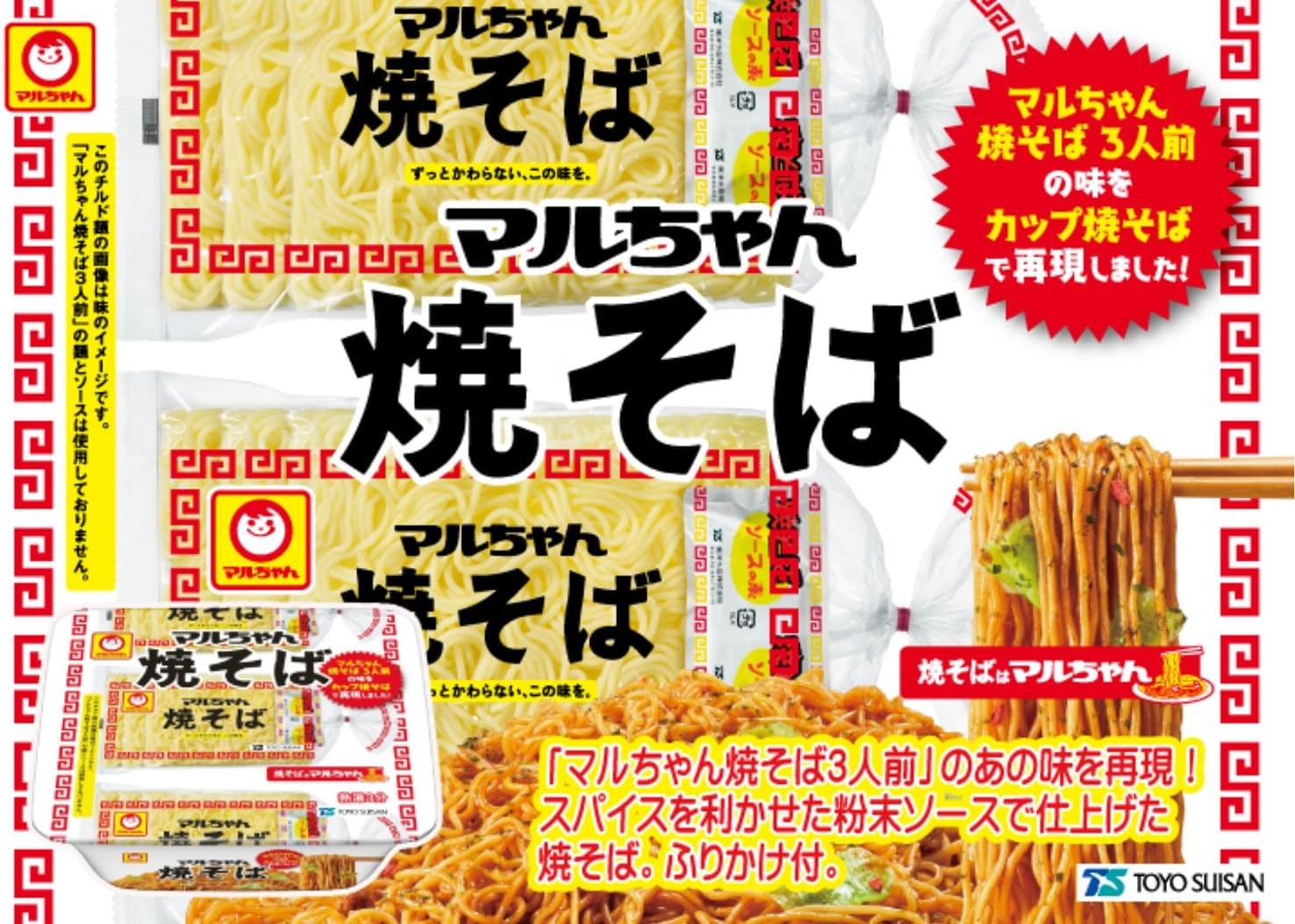再现了"Maruchan炒荞麦面3人份"的那样的味道。 用调味粉制成的烤荞麦面。 附带挂绳。 光滑有花纹感的圆形刀刃切割的面条。 面重量:90克。 三分钟恢复。 以"Maru酱炒荞麦面3人份"为主题,是一款香辣调味料的粉末酱。 附带挂绳。 卷心菜、带味研磨肉。