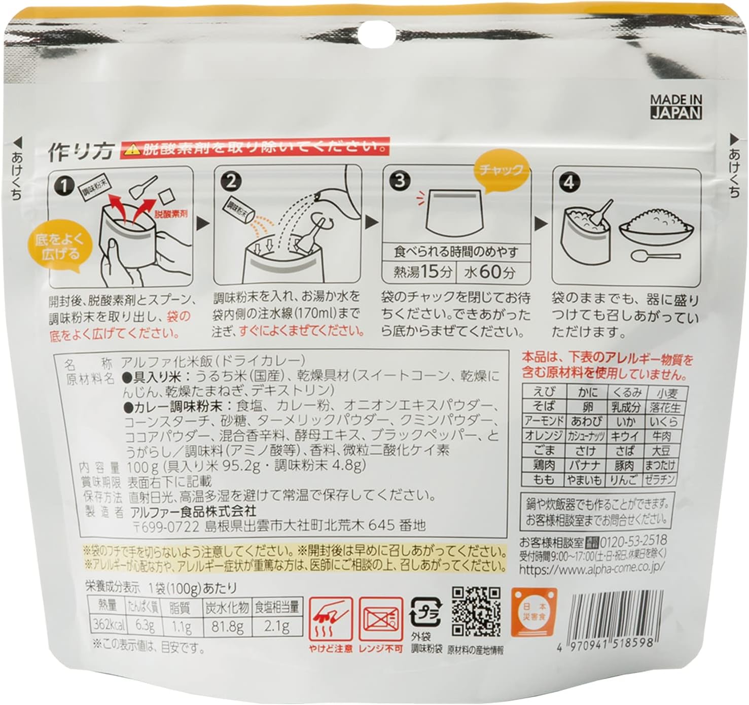 采用特定原材料等(过敏物质)28种不使用眼睛的食物过敏性的长期保存食品。 使用日本产米100%。 这是一款有着吸引食欲的香料丰富的干咖喱。 内容量/100g⇒美味量/270g(1杯大份量) 只需注入热水或水即可轻松烹饪。 (热水15分钟、水(20℃)60分钟) 无需餐具:因为里面放入汤匙,袋子就会变成容器,所以可以直接食用。 设计特制:从生产日起保存5年。 轻便小巧,便于携带,收纳性优异。 Rolling Stick是什么? :日常吃紧急食物,吃完后可重复购买,是一款家庭储备的方法。 "如果介意的话,保质期会大幅变大"的失败的同时,可以提供适合食用的物品。 安心米各种菜肴,烹饪也很简单! 适合户外、露营等平时使用,也适合作为骑行服。 ※日本灾害食品学会认证·哈拉尔认证商品 ISO22000、FSSC22000认证工厂制造。 蛋白质6.3克、脂肪1.1克、碳水化合物81.8克、食盐相当量2.1克(每袋)