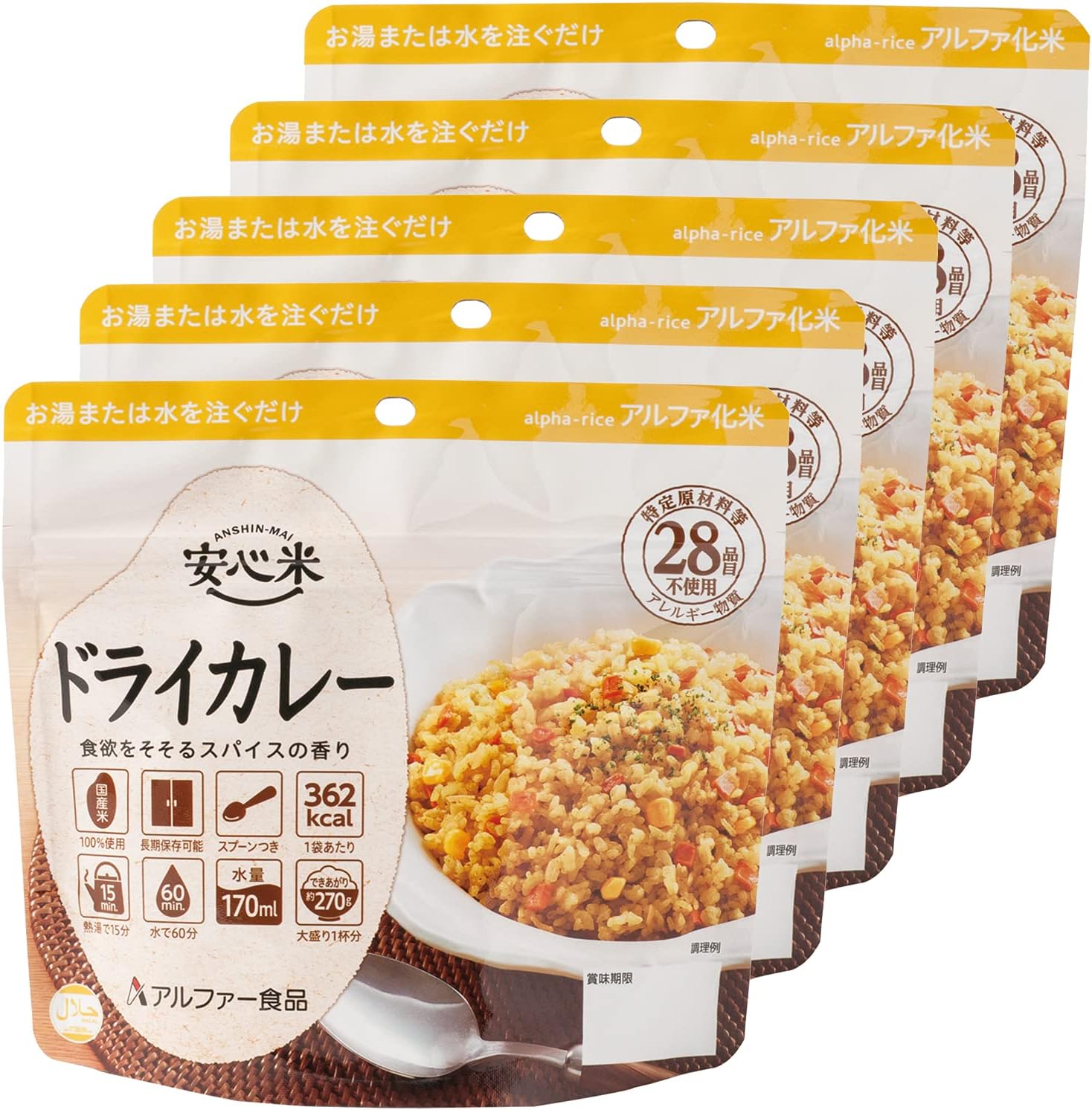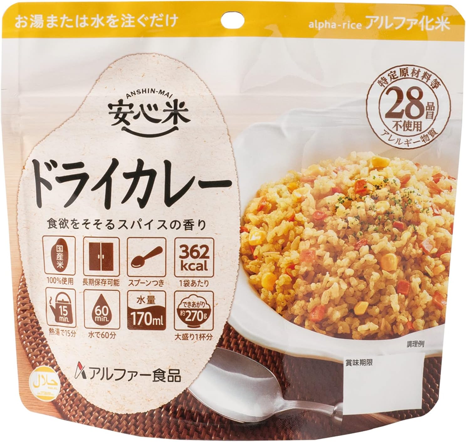 采用特定原材料等(过敏物质)28种不使用眼睛的食物过敏性的长期保存食品。 使用日本产米100%。 这是一款有着吸引食欲的香料丰富的干咖喱。 内容量/100g⇒美味量/270g(1杯大份量) 只需注入热水或水即可轻松烹饪。 (热水15分钟、水(20℃)60分钟) 无需餐具:因为里面放入汤匙,袋子就会变成容器,所以可以直接食用。 设计特制:从生产日起保存5年。 轻便小巧,便于携带,收纳性优异。 Rolling Stick是什么? :日常吃紧急食物,吃完后可重复购买,是一款家庭储备的方法。 "如果介意的话,保质期会大幅变大"的失败的同时,可以提供适合食用的物品。 安心米各种菜肴,烹饪也很简单! 适合户外、露营等平时使用,也适合作为骑行服。 ※日本灾害食品学会认证·哈拉尔认证商品 ISO22000、FSSC22000认证工厂制造。 蛋白质6.3克、脂肪1.1克、碳水化合物81.8克、食盐相当量2.1克(每袋)