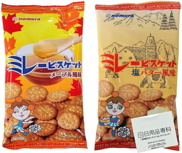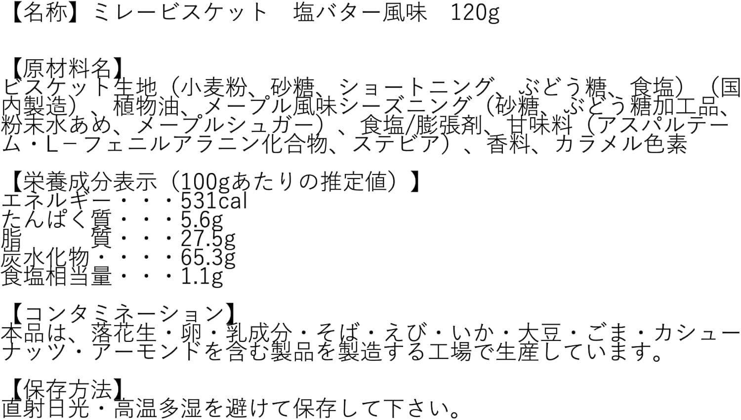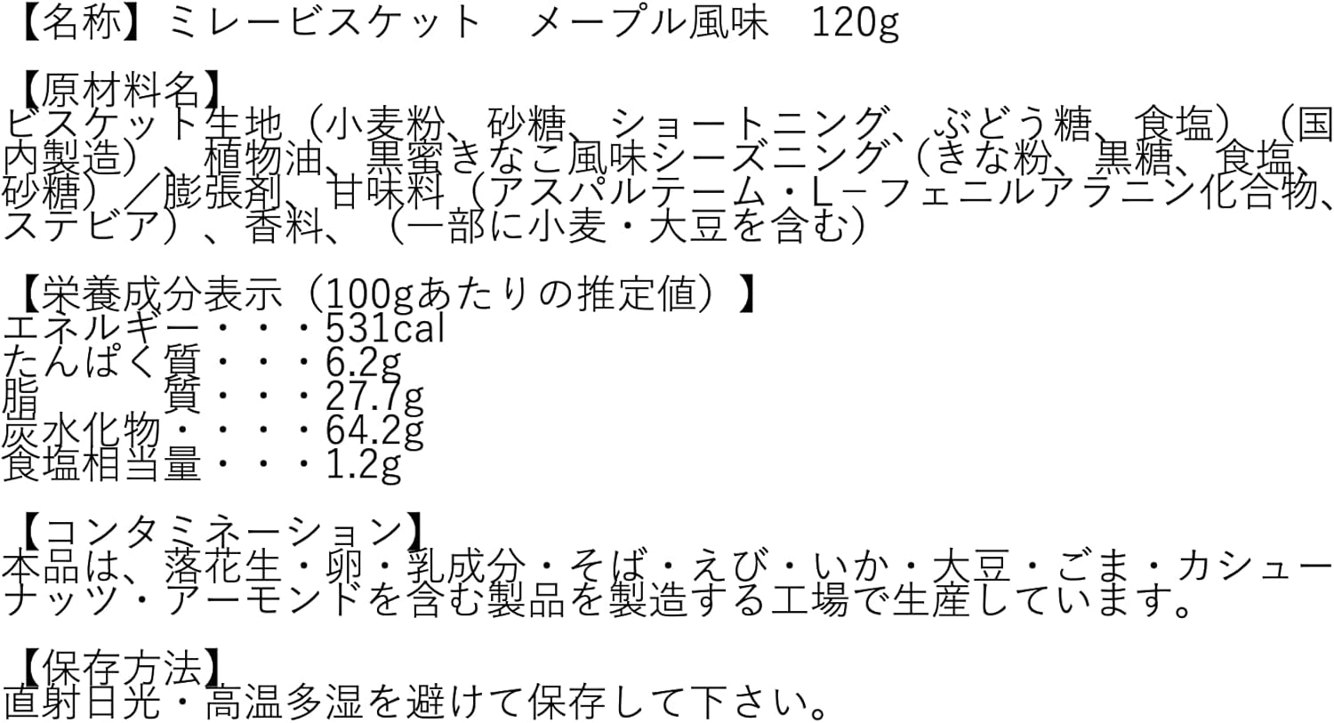 ①枫叶风味 【原材料名称】 饼干面料(小麦粉、砂糖、起酥油、葡萄糖、食盐)(国内制造)、植物油、枫叶风味季节(砂糖、葡萄糖加工品、粉末糖、枫糖)、食盐/膨胀剂、甜味剂(阿斯巴甜、L-苯丙氨酸化合物、甜)、香料、焦糖 色素 【营养成分表 (100克的推定值)] 能量・・・531cal 蛋白质・・・5.6g 脂 质・・・27.5g 碳水化合物・・・・65.3g 食盐相当量・・・1.1g 【接触污染物】 本品由花生、鸡蛋、牛奶成分、荞麦、虾、鱿鱼、大豆、芝麻、腰果、杏仁制作的产品工厂进行生产。 【保存方法】 请避免阳光直射、高温潮湿。 【保质期】 从制造日起210天 ②盐黄油风味 【原材料名称】 饼干面料(小麦粉、砂糖、起酥油、葡萄糖、食盐)(国内制造)、植物油、盐黄油风味季节(砂糖、食盐、全脂奶粉、葡萄糖、酵母提取物、牛奶等为主要原料的食品、淀粉、黄油)/膨胀剂、甜味剂(阿斯巴甜。 L-苯丙氨酸 化合物、甜菊)、香料、(部分含小麦、牛奶成分) 【营养成分标示(100g的推定值)】 能量・・・540cal 蛋白质・・・5.7g 脂 质・・・29.4g 碳水化合物・・・・63.2g 食盐相当量・・・1.0g 【接触性】 本品落花生、鸡蛋、牛奶成分、荞麦、鱿鱼、大豆、芝麻 腰果、工厂进行生产,包括杏仁。 【保存方法】 请避免阳光直射、高温潮湿。 保质期:从制造日起210天