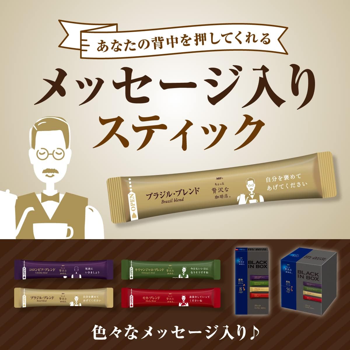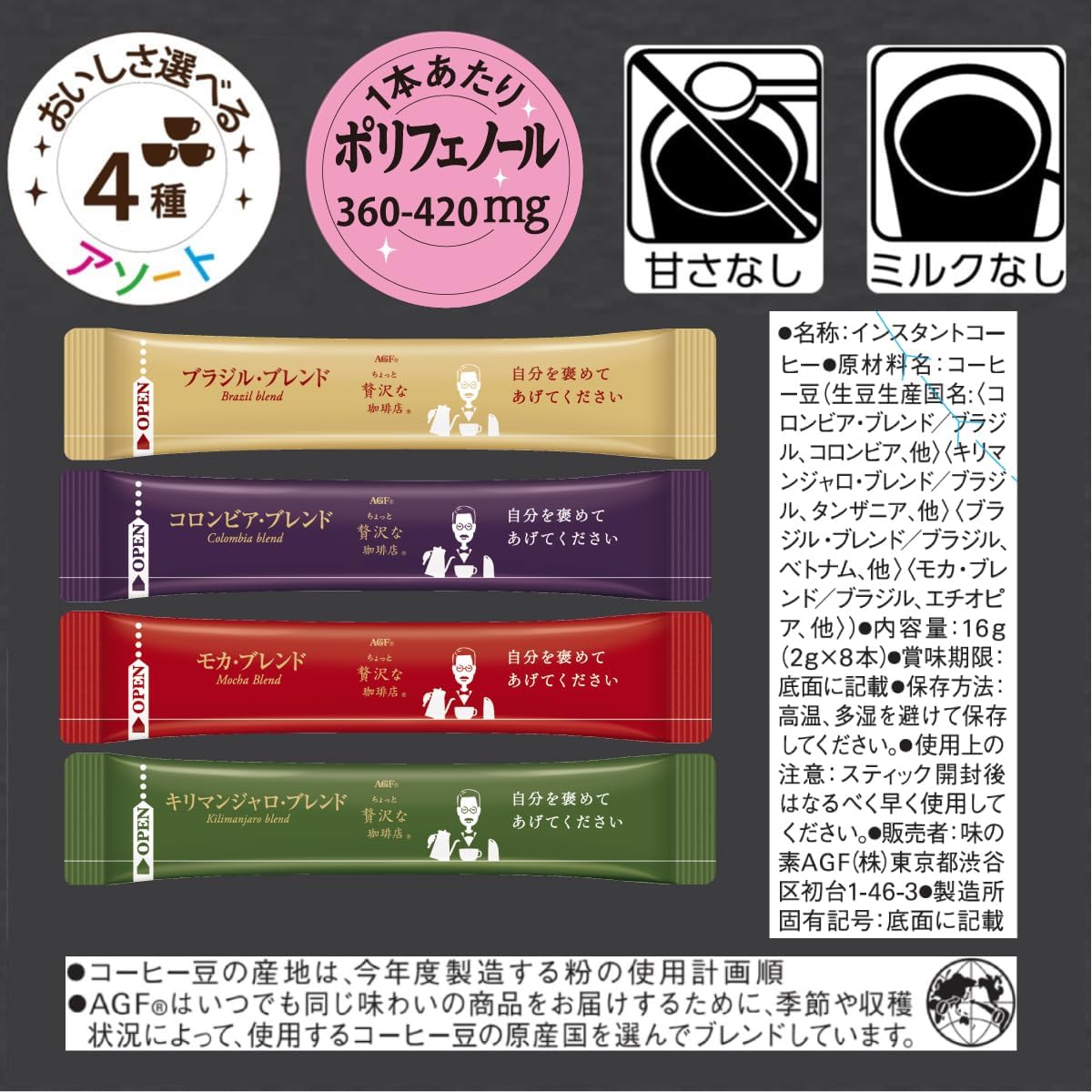 享受4种黑色咖啡。 "稍奢侈的咖啡店 黑内盒"使用精选咖啡豆AGF独有的"T2ACMI烘焙"技术,精心烘焙。 采用速溶式咖啡,无需加热,只需在-40°C下真空干燥制法,无需散发咖啡原本丰富的香味和浓郁的风味,享受冲泡的咖啡味道。 "稍奢侈的咖啡店 黑色内盒" 产地混合混装20支是〈哥伦比亚・混合〉〈巴西・混合〉〈摩卡・混合〉〈基里曼贾罗・混合〉的4种讲究味道,可享受1盒中的容量尺寸。 每杯1杯都是新鲜的独立包装棒咖啡(无黑色、无牛奶、甜味)。 不仅可以搭配黑咖啡,也可以和棒状咖啡一起享受办公室和家庭的乐趣。 由于是混合装,可以根据心情享受丰富的咖啡。 从咖啡豆的烘焙到填充都在国内工厂一贯生产,配合日本人的味道开发出来的一次性咖啡。