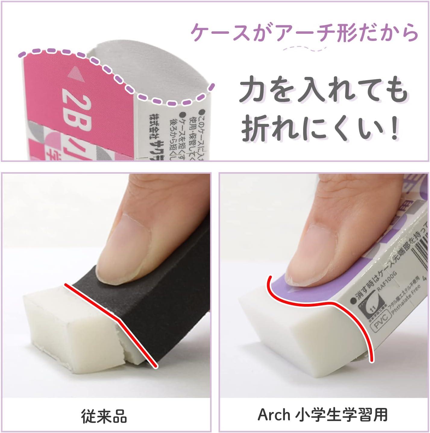 ●推荐小学生使用的拱形橡皮擦 ◎深铅笔容易消失 使用泡沫材料(特殊发泡体配方) 适合小学生使用的2B、4B等深铅笔。 ・轻轻一按即可擦除,不会消失 ◎易拿且不易折断 ・因为是有厚度的形状,所以小学生也能牢固握住 ・带有橡皮擦不易折断的拱形收纳盒 刚刚好的尺寸和设计 可收纳在小巧的笔盒中的尺寸。 ・学习用的真面目中让人感到愉悦的设计 ・防滑、缝纫机、姓名栏